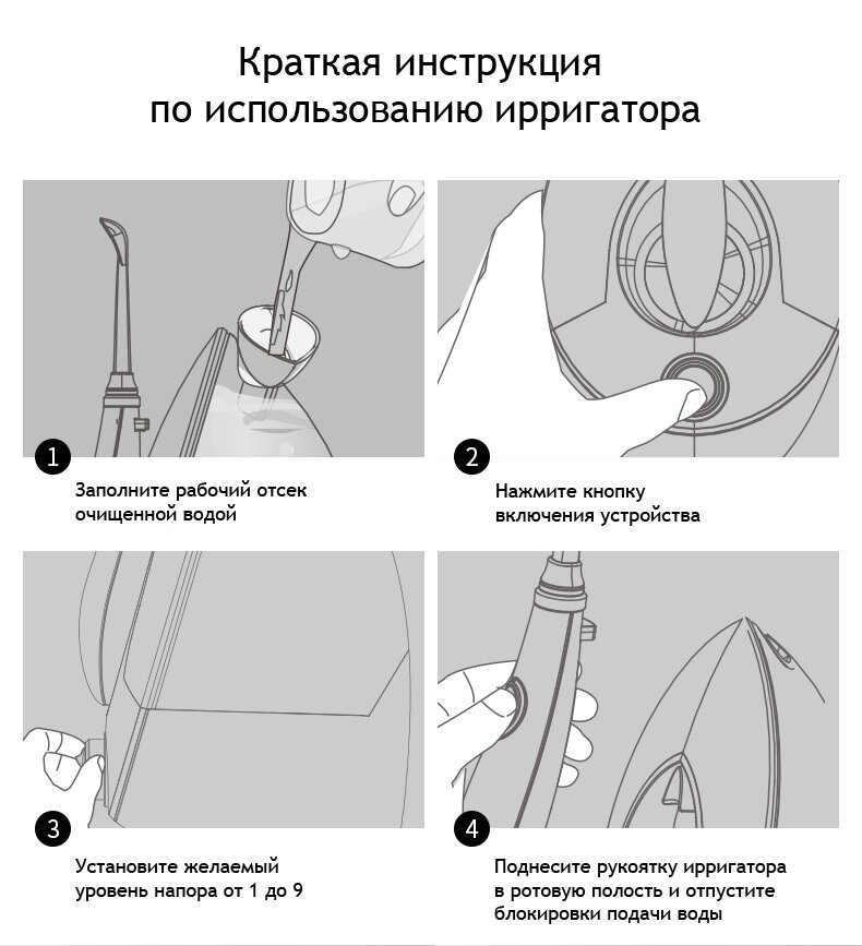 Включити іригатор і відрегулювати напір води можна однією кнопкою. При натискання помпа включається, обертання регулятора змінює натиск рідини, що подається.