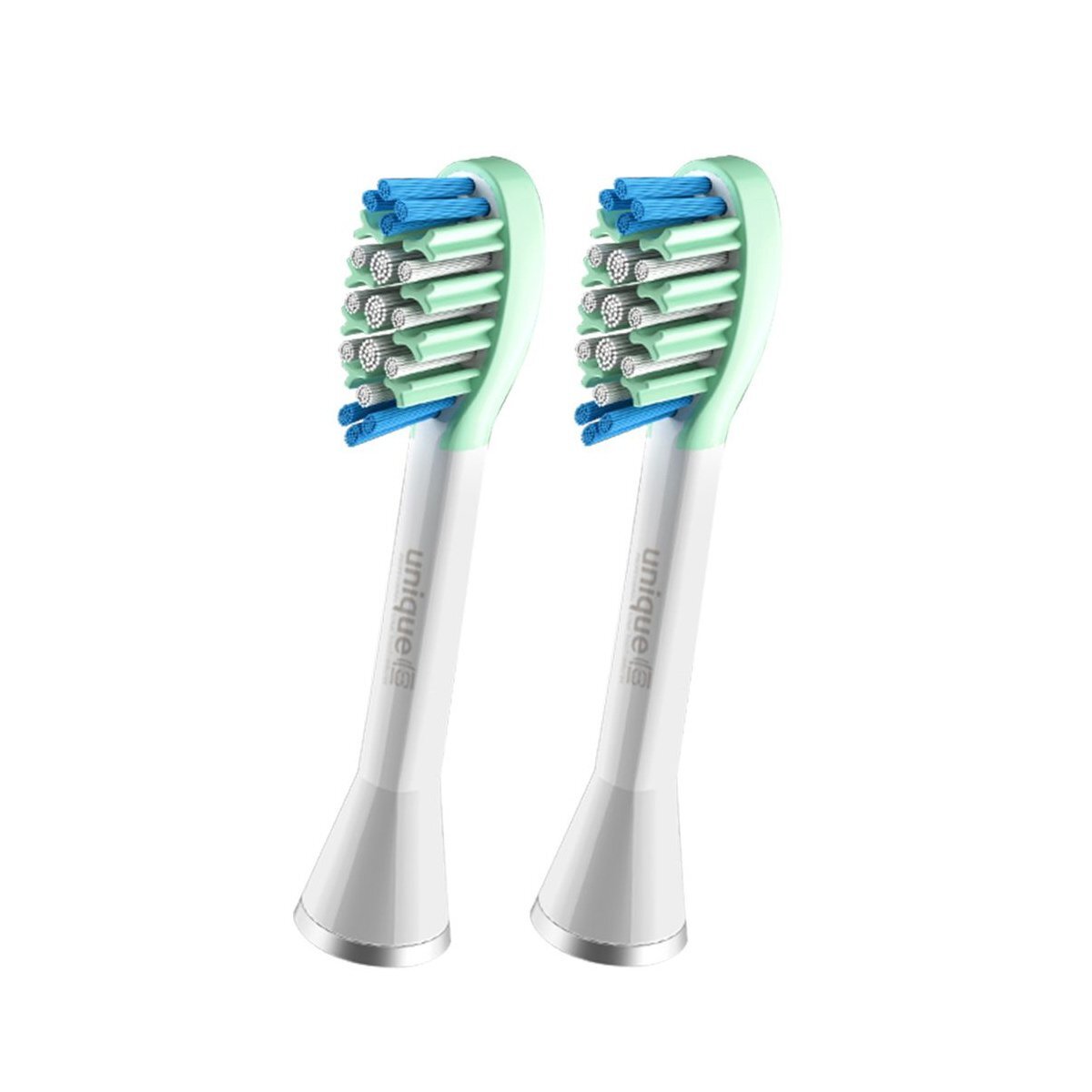 Щетина насадки складається з волосинок товщиною 0 , 2 мм об'єднаних в щільні пучки для точкового впливу на зубну емаль. Передня і задня зони довші, забезпечують хороше вичищення між зубами. Unique Whitening ефективно видаляє наліт від чаю, кави, сигарет і відбілює зуби на 2 тони протягом декількох тижнів.