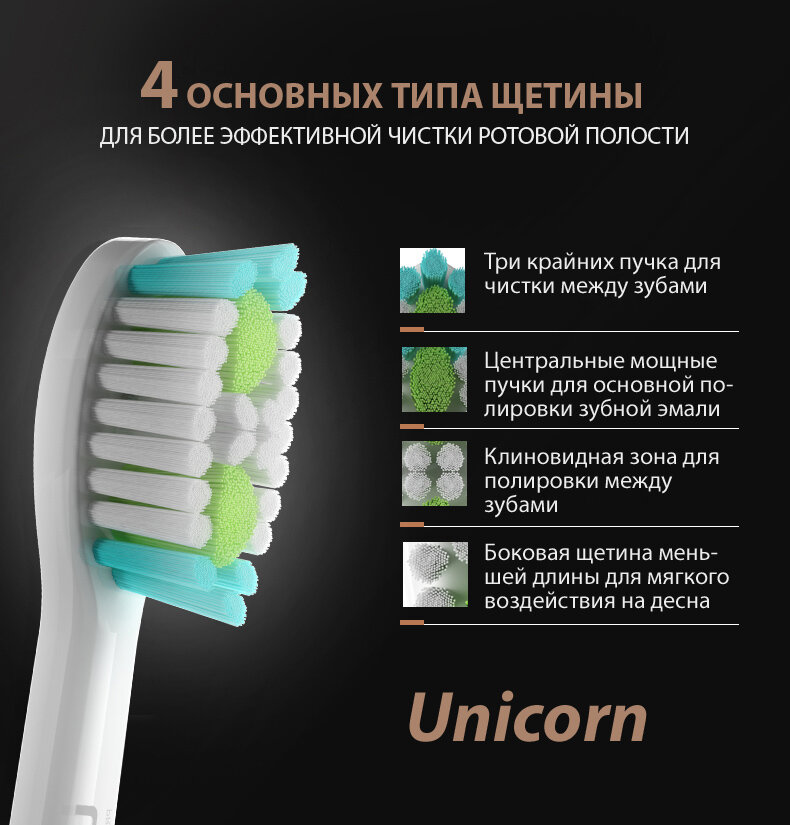 Насадка, що йде в комплекті - Unicorn. Має щетину середньої жорсткості, ефективна при відбілюванні, добре вичищає між зубами.