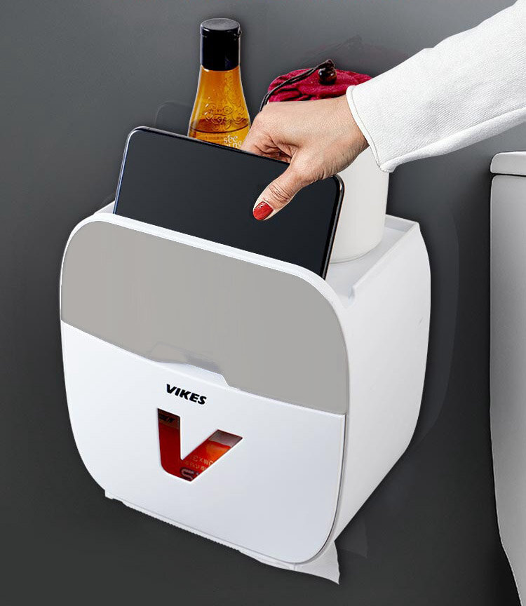 Тримач для туалетного паперу VIKES має відділення для рулонного туалетного паперу, контейнер або слот для гаджетів.