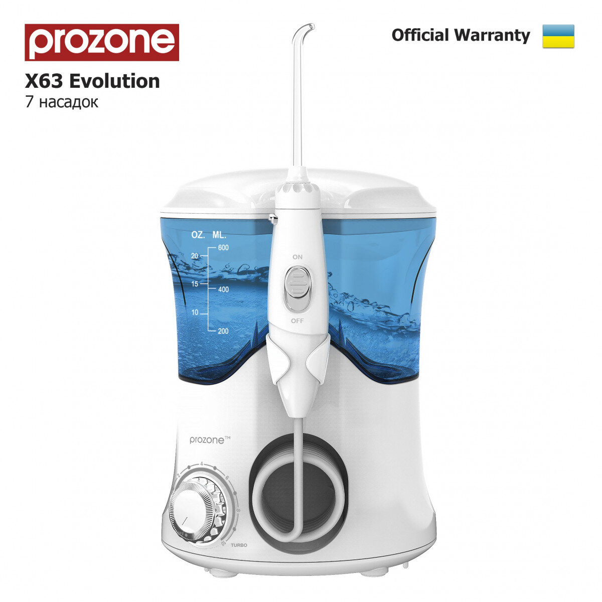 Гарантия на ProZone X63 Evolution — 12 месяців. В комплекті з іригатором йде украинська інструкція, розроблена стоматологами та гарантійний талон.