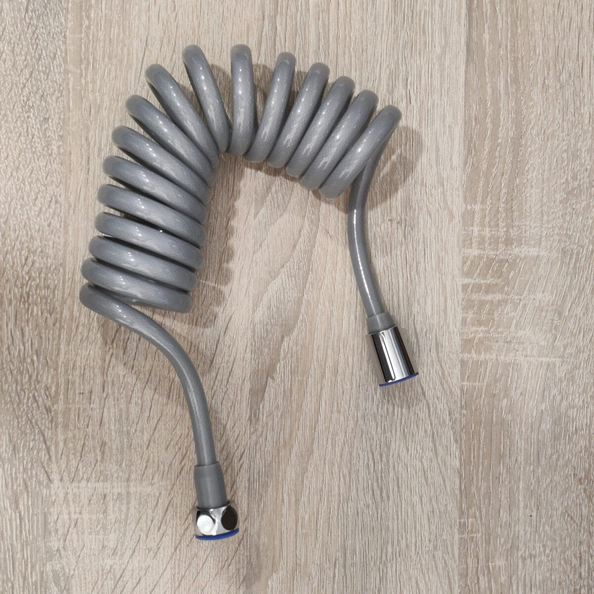 Шланг для гігієнічного душу (бідетти) спіральної форми. Не займає багато місця, після витягування повертається до попереднього положення. Гайки підключення на 1/2 дюйма, виготовлені з мідного сплаву, кріплення з нержавіючої сталі. Шланг із армуванням. Є ущільнюючі прокладки.