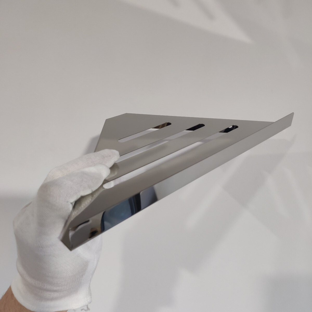 Кутова душова полиця для ванної з цільного листа нержавіючої сталі марки 304. Покриття – глянець (полірування).