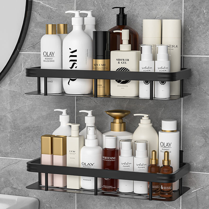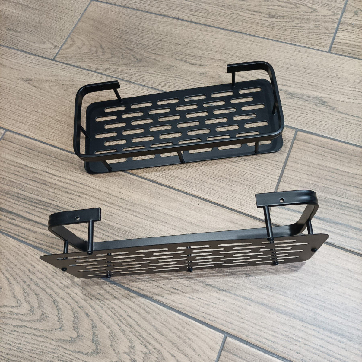 Надійна полиця для ванної кімнати. Полиця виготовлена ​​з алюмінію – міцна і не боїться корозії. Має стильний дизайн, чорний колір та гладку поверхню.