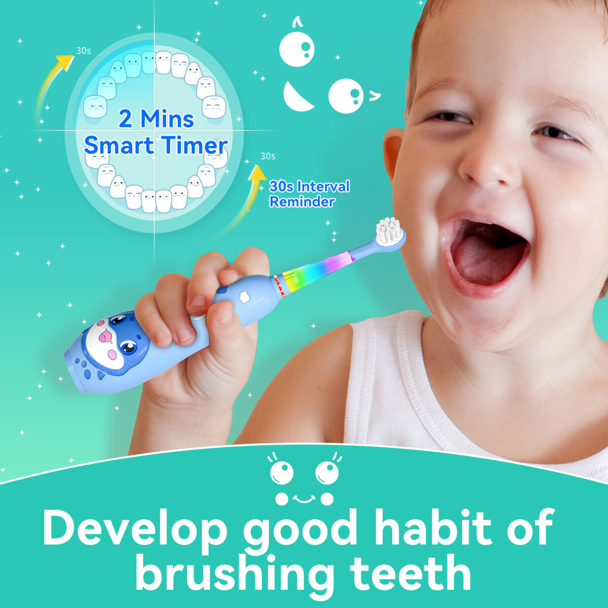 Світлові індикатори або зміни кольору допомагають дитині слідкувати за часом та завершеністю чищення.