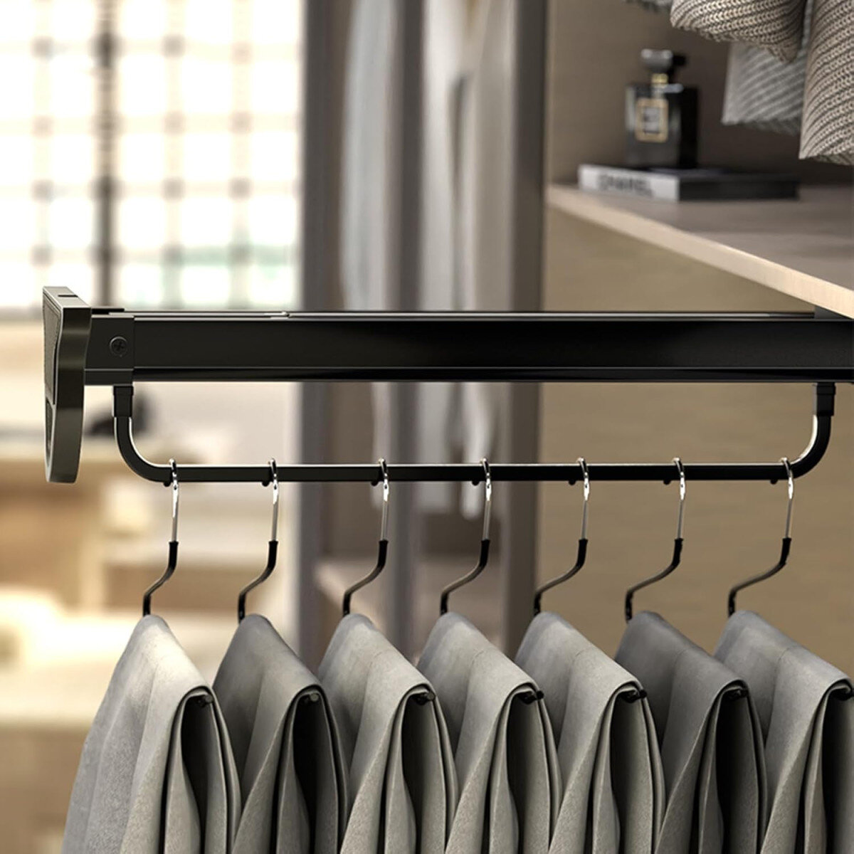 Висувна штанга-мікроліфт поєднує естетику, зручність і надійність — ідеальне рішення для сучасних гардеробних систем.