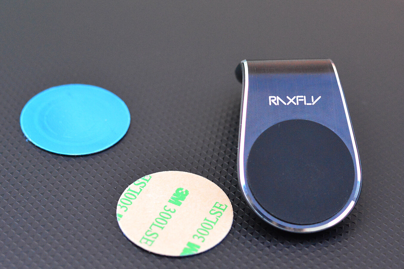 Тримач для телефону RAXFLY кріпиться на дефлектор за допомогою затиску-прищіпки. Фіксація міцна, легко утримується навіть важкий телефон. Сам тримач маленький, не привертає до себе увагу. Телефон кріпиться за допомогою магнітів (5 неодімових магнітів). У комплекті йдуть 2 металевих тримача, які мають клейку сторону і можуть бути приклеєні до телефону або на його чохол. Затиск кріплення тримача до дефлектора і місце кріплення телефону мають силіконові вставки.