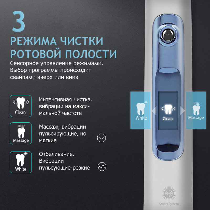 Особливістю щітки є сенсорне управління режимами. Вибір програми відбувається свайпамі вгору або вниз. Сенсор відмінно реагує на мокрі пальці і навіть рукавички. Свайп в сторону відображає рівень заряду акумулятора. Також на дисплеї відображається час минув від початку чищення зубів. Зубна щітка обладнана 2-х хвилинним таймером з додатковим зонуванням по 30 секунд.