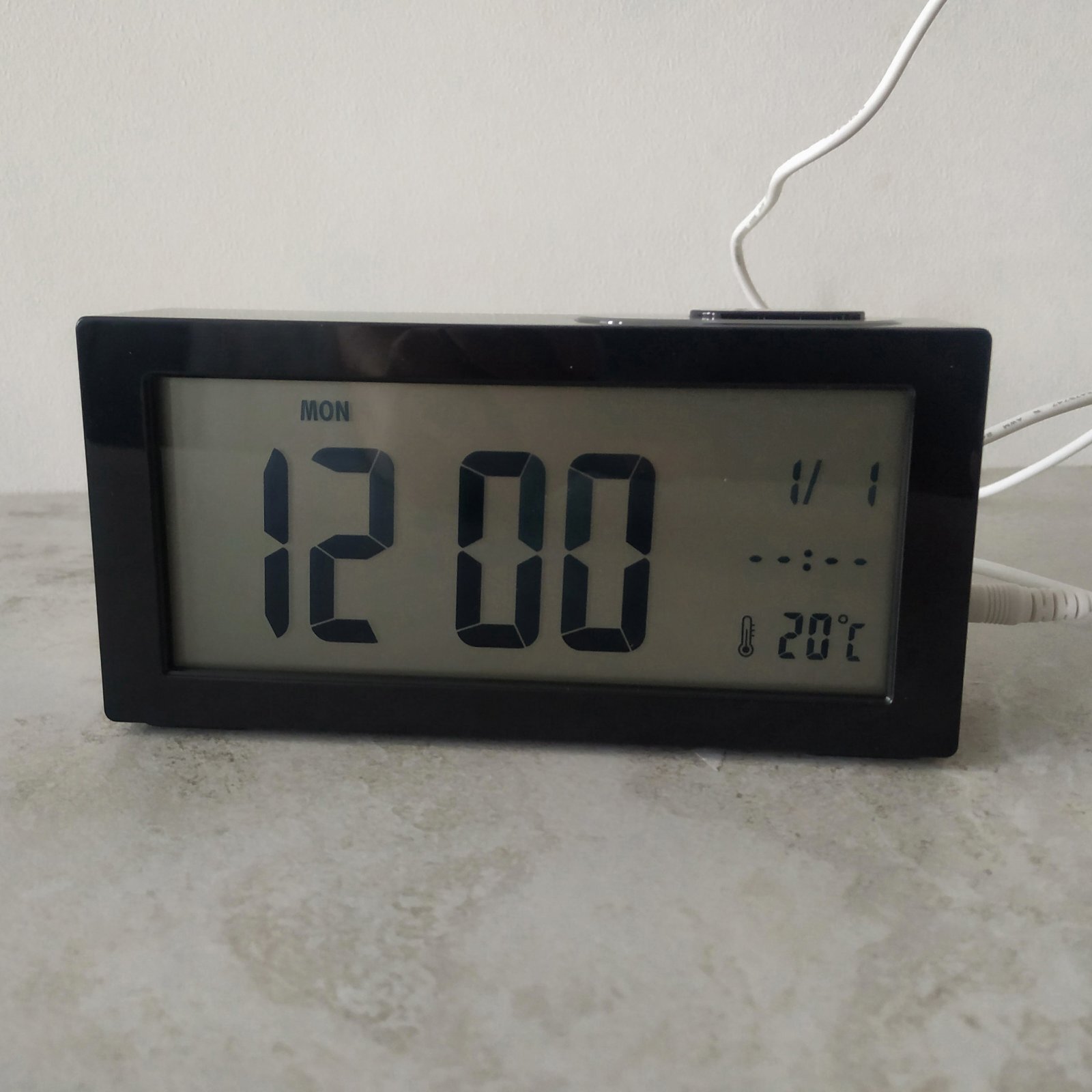 - Годинник показує час, дату, температуру, день тижня, функція нічника, є функція повтору сигналу