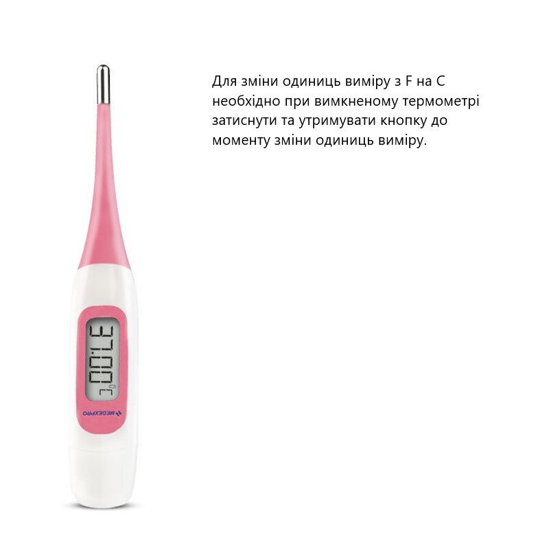 Для зміни одиниць виміру з F на С необхідно при вимкненому термометрі затиснути та утримувати кнопку до моменту зміни одиниць виміру.
