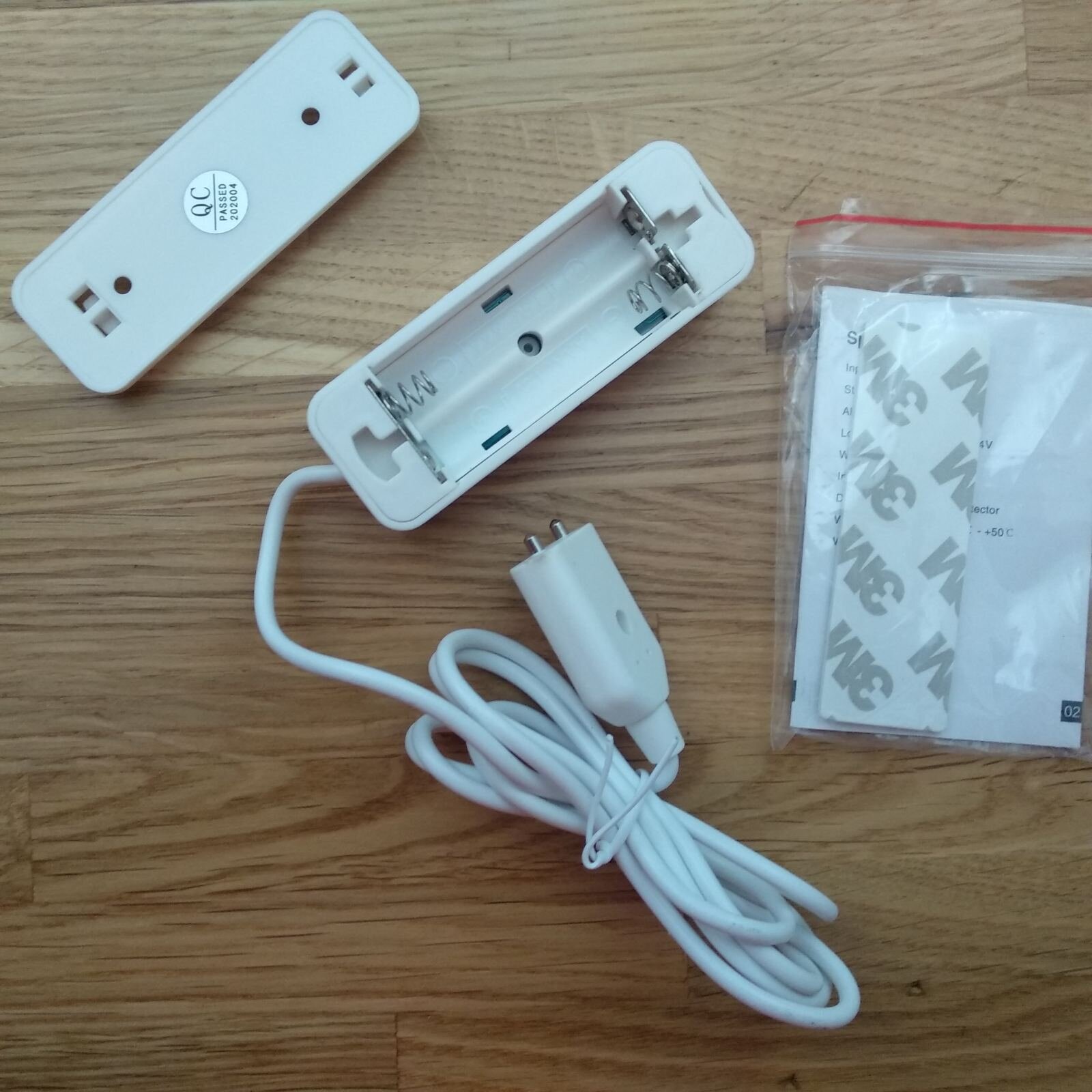 Датчик конструктивно состоит из блока управления и выносного (на кабеле длиной 1м) сенсора с коррозионно-стойкими контактами. При соприкосновении контактов сенсора с водой, блок управления отправляет соответствующий сигнал, который обрабатывается приложением смартфона. В зависимости от настроек приложения и наличия крана с электроприводом может быть выполнено закрытие такого крана. Блок управления настенного исполнения, его фиксация на стене осуществляется двухсторонним скотчем (в комплекте). Питание от 2-х пальчиковых батареек (ААА), батарейки в комплект не входят. Открывается батарейный отсек продольным смещением задней крышки блока в направлении выхода кабеля. При низком заряде батареек отправляется сообщение на смартфон. В комплекте идет инструкция на английском языке.