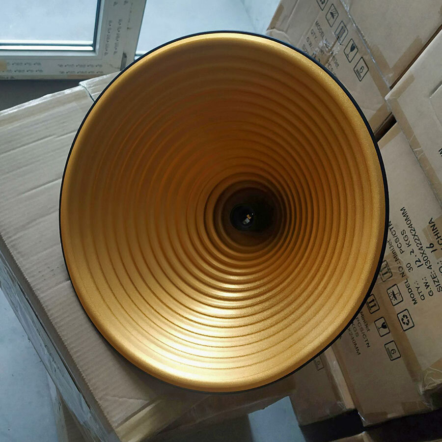 Підвісний світильник у сучасному стилі виготовлений із алюмінію. Складається із зовнішньої та внутрішньої частини. Зовні чорний, усередині – бронза. Підійде для інтер'єрів у стилі модерн, лофт та для скандинавського стилю. Контраст між чорним зовнішнім та бронзовим внутрішнім шаром не тільки виглядає модно, але й забезпечує затишне світло.
