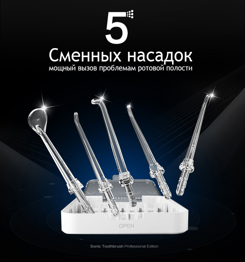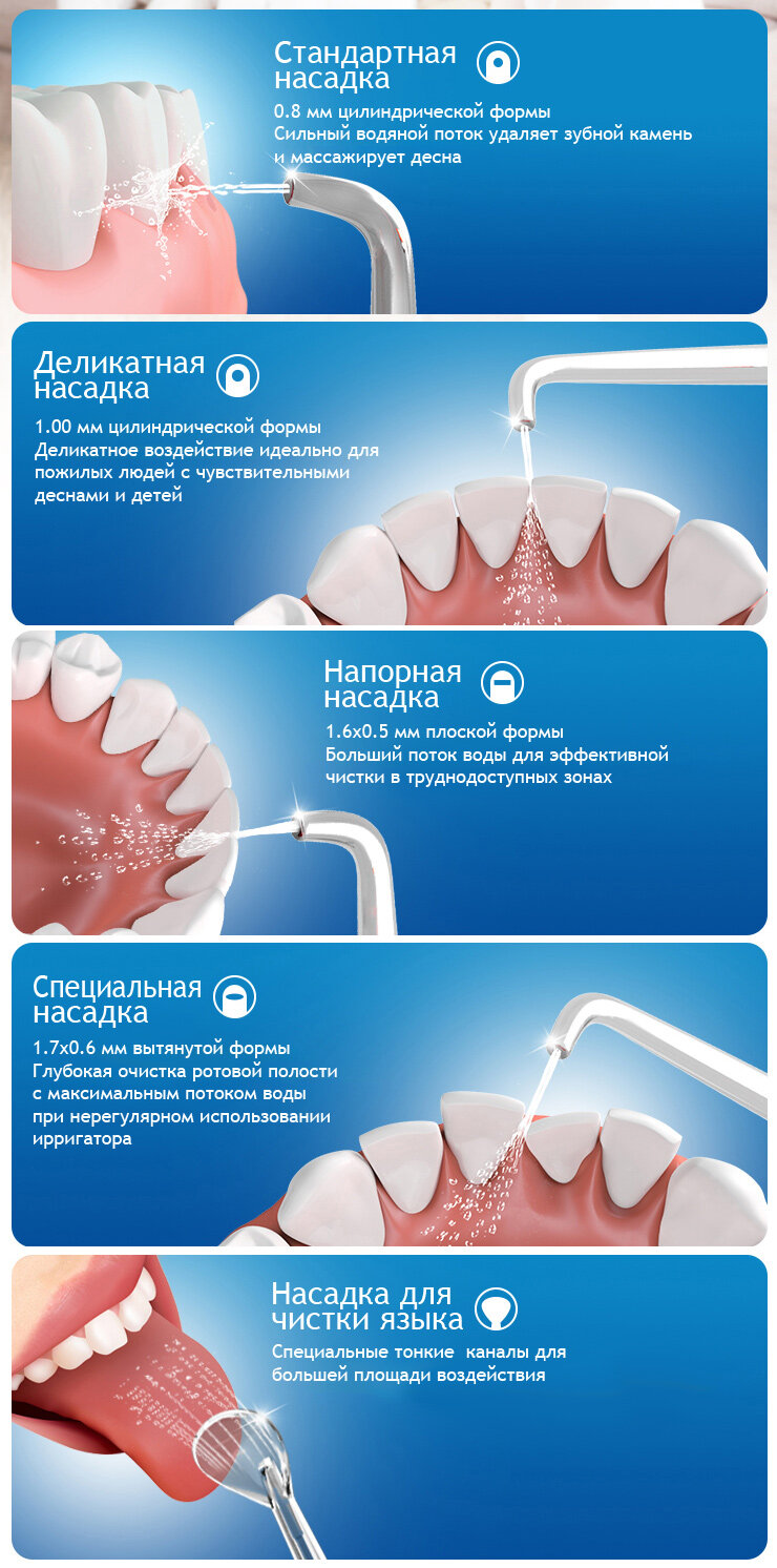 | Назначение | Удаление налета Для массажа десен Повседневная Промывка брекетов Глубокое очищение Чистка межзубных карманов Деликатная Для имплантов |
