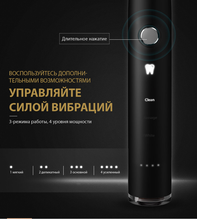 Також користувач має можливість змінювати рівень потужності звукового генератора. Для цього необхідно затиснути кнопку включення щітки під час її роботи і дочекатися зміни режиму.