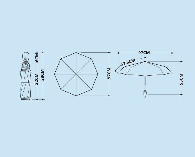 Радиус купола по спице - 97 см, длина зонта - 55 см (28 см в сложенном виде). Вес - 350 грамм.