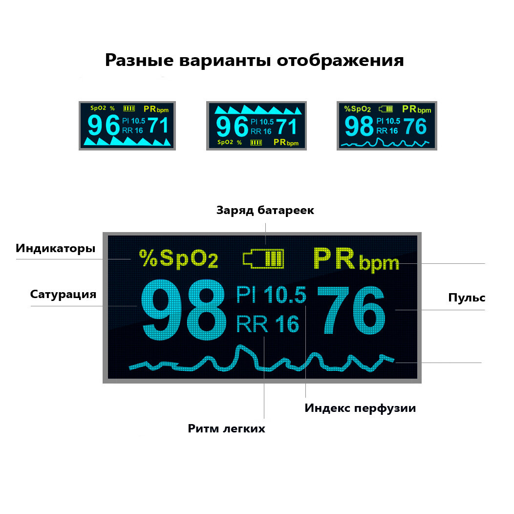 | Измеряемые параметры | Пульс (PR) Индекс перфузии (PI) Частота дыхания (RR) Уровень сатурации (SpO2) |