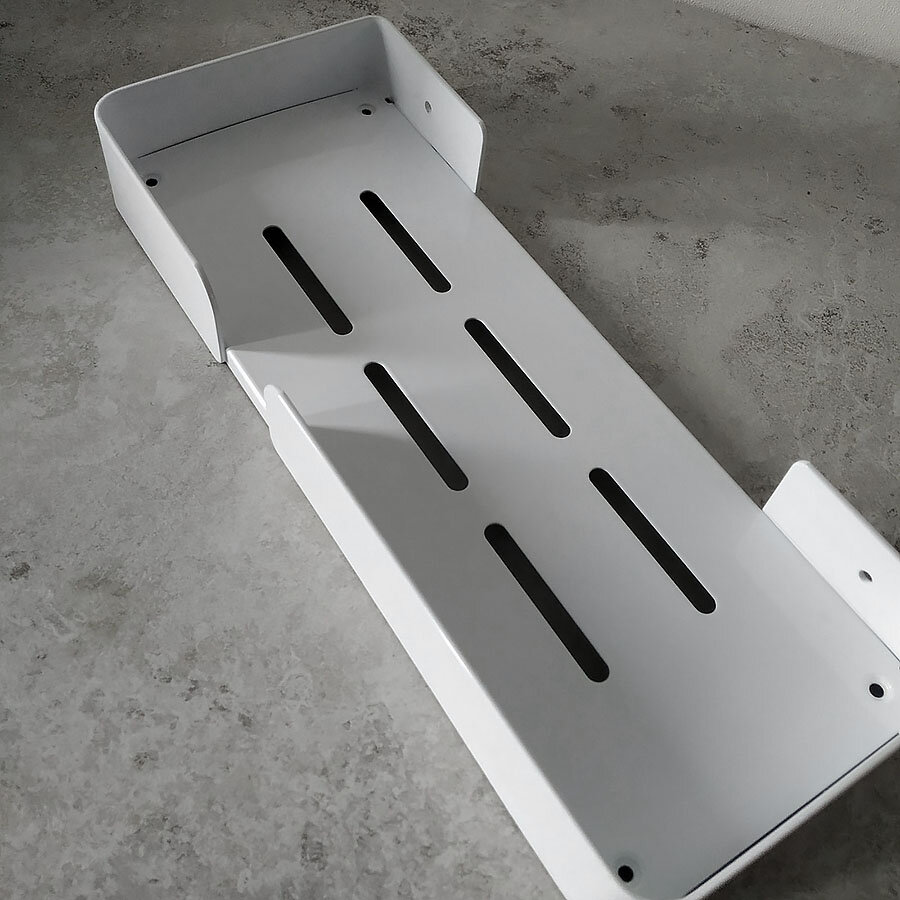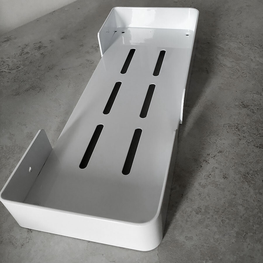 Полиця для ванної виготовлена ​​з алюмінію, стійка до дії вологи, не іржавіє. Полиця має сучасний дизайн (модерн, лофт), що гармонійно поєднується з більшістю дизайнерських рішень при облаштуванні ванної кімнати. Покриття – міцний ґрунт + фарба.