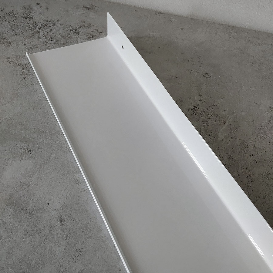Полка для ванной из алюминия. Полка может крепиться обычно и наоборот (в зависимости от дизайнерских предпочтений), гармонично сочетается с большинством дизайнерских решений при обустройстве ванной комнаты. Прорези - отсутствуют, поверхность плоская. Дизайнерская линейка полок от IwConcept. Покрытие - прочный грунт + белая глянцевая краска.