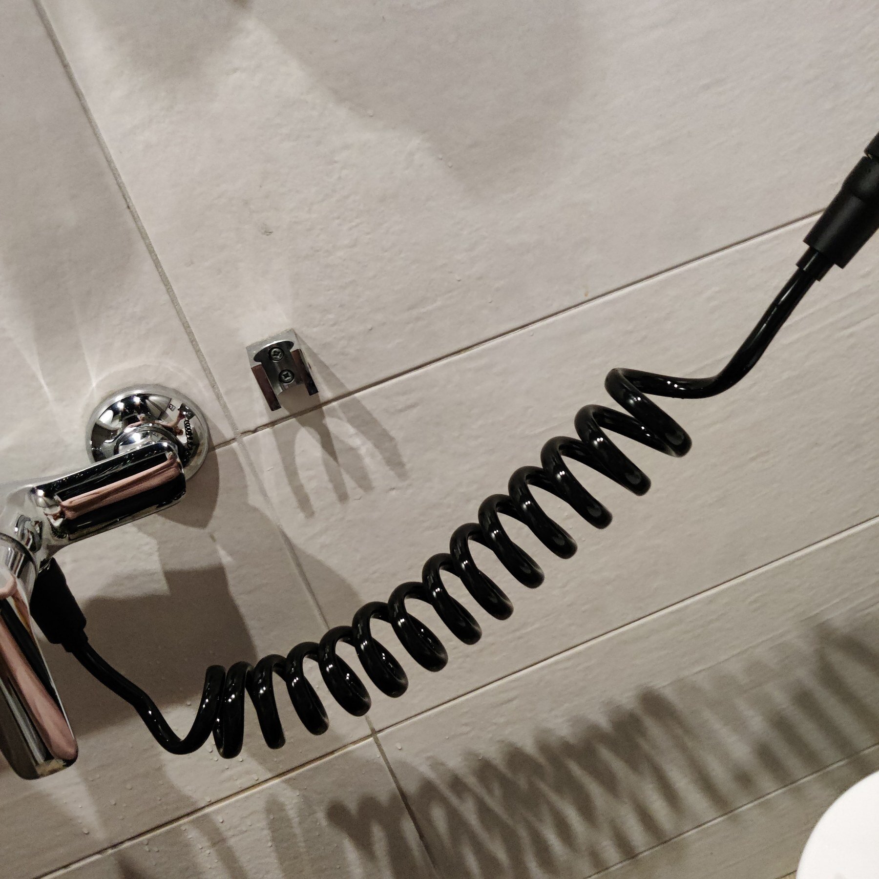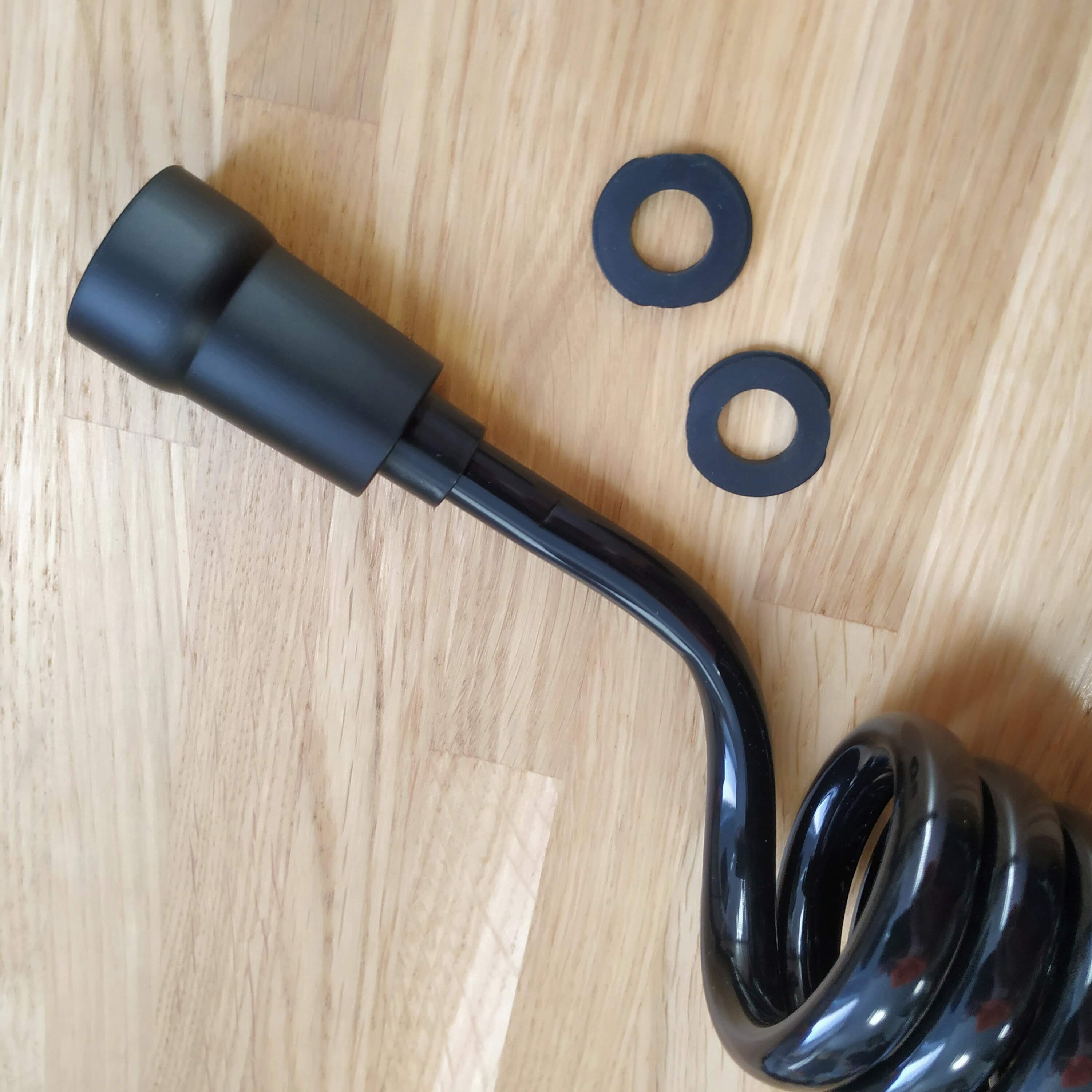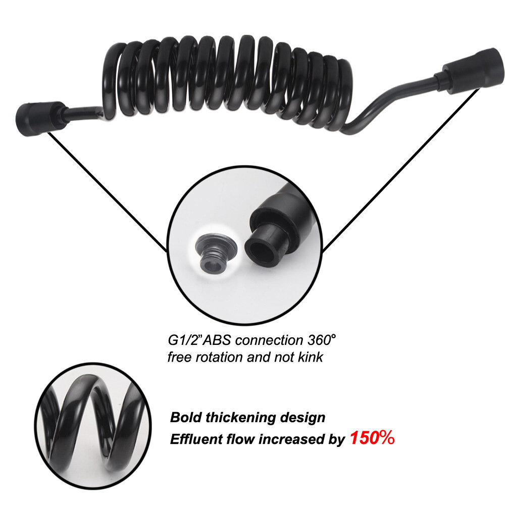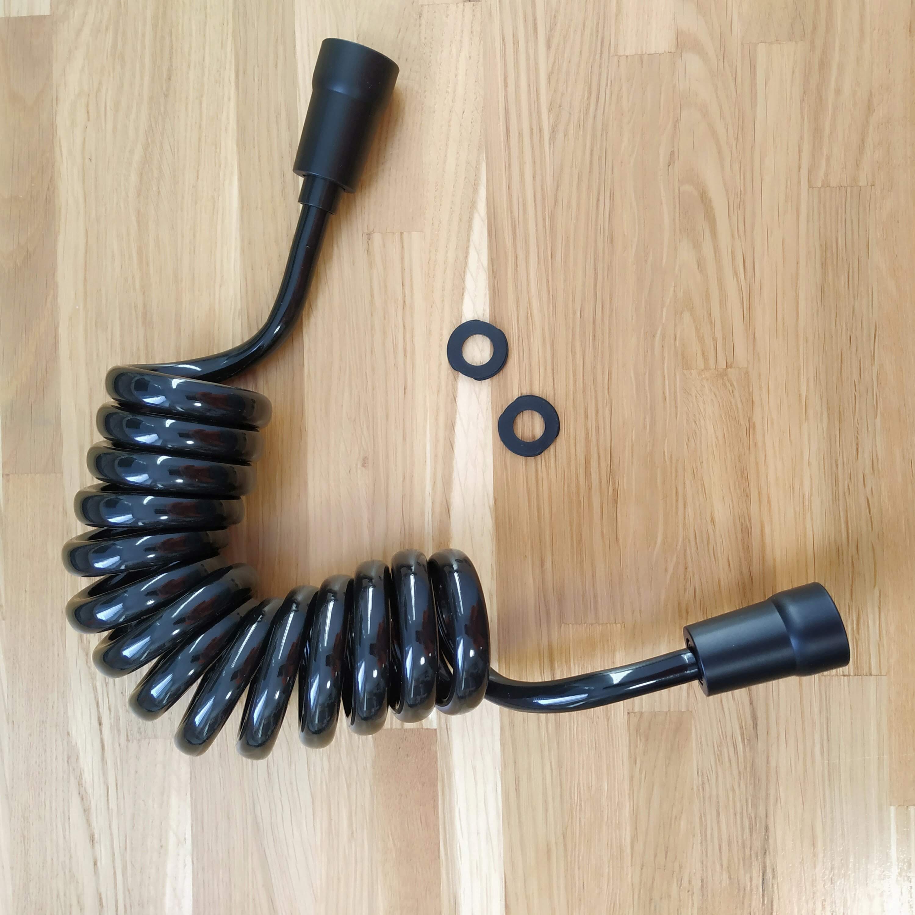 Шланг для гігієнічного душу (бідетти) спіральної форми. Не займає багато місця, після витягування повертається до попереднього положення. Гайки підключення на 1/2 дюйми, виготовлені зі спеціального пластику. Є ущільнюючі прокладки.