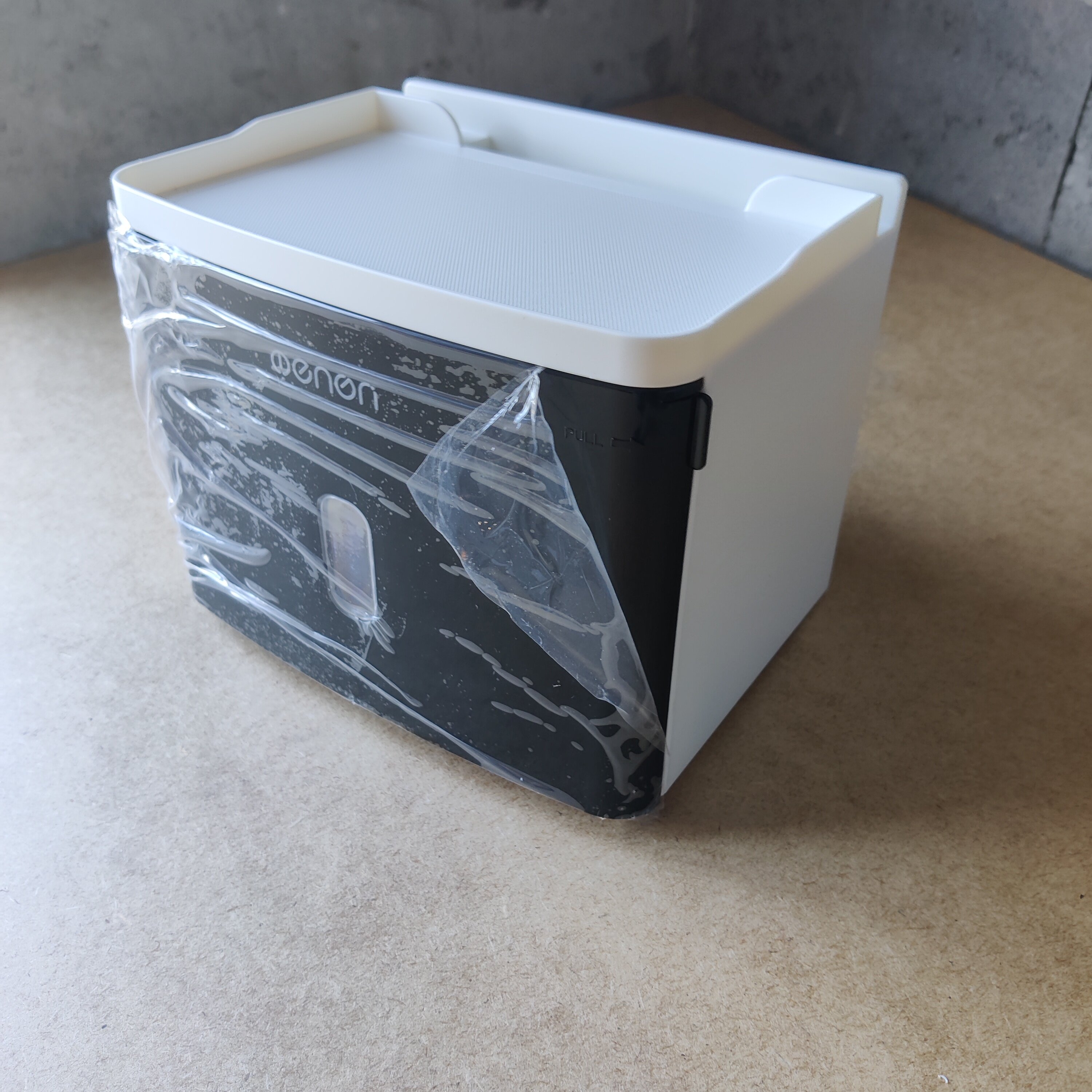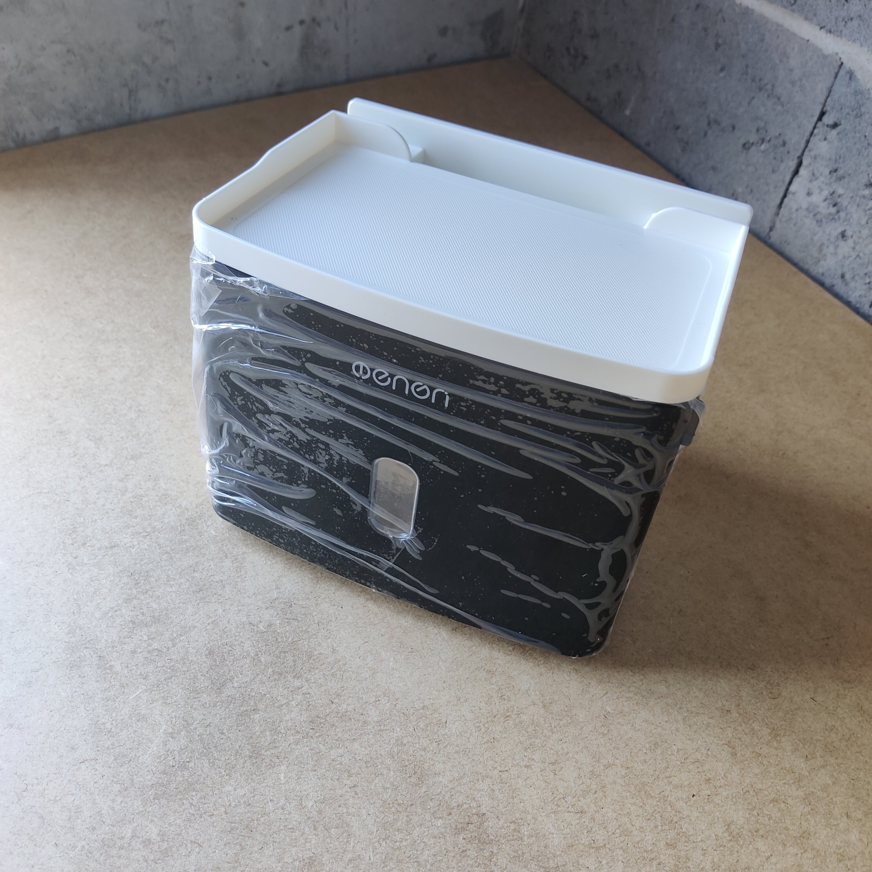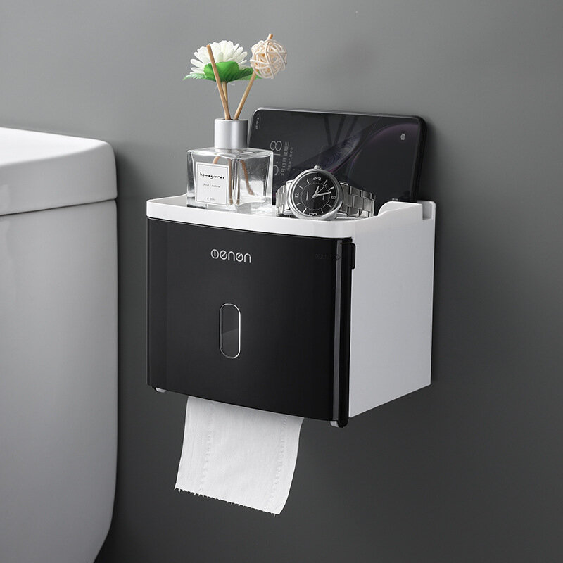 Сучасний і зручний тримач, що клеїться, виготовлений з удароміцного ABS пластику білого кольору з чорною вставкою. Аксесуар має відділення для рулонного туалетного паперу, а також висувну скриньку та слот для гаджетів. Тримач також можна заправляти серветками. Аксесуар не боїться води та захищає ваші речі від вологи. Витримує вагу до 2.5 кілограмів і кріпиться на рівну гладку поверхню за допомогою самоклеючої пластини, яка йде в комплекті. Вам не доведеться свердлити стіни.