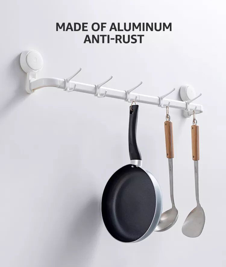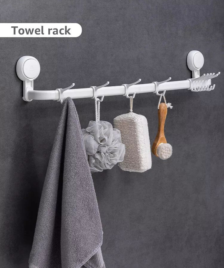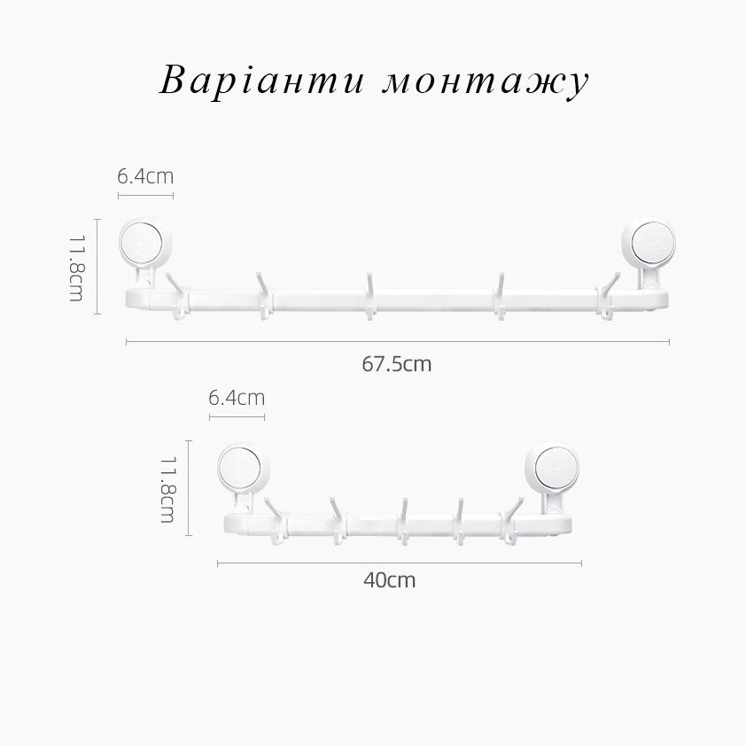 Вішалка для рушників у ванну із вакуумним кріпленням на стіну. Кріплення виготовлене з пластику, штанга для рушників - з алюмінію. 2 варіанти довжини, гачки можна не встановлювати.