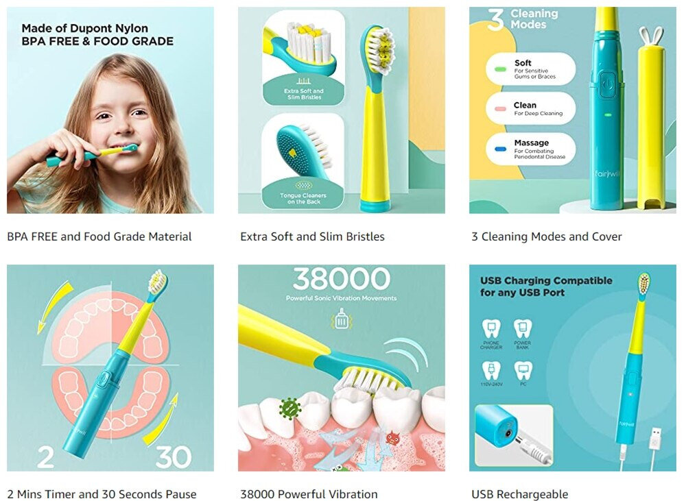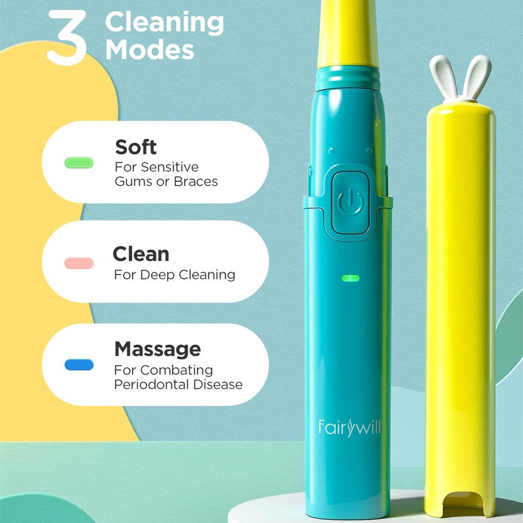 Пока улыбка вашего малыша продолжает расти и развиваться, самое время начать здоровые привычки ухода за полостью рта. Звуковая электрическая зубная щетка Fairywill сочетает в себе частоту 38000 дв/мин и очень мягкие щетинки, обеспечивая полную очистку зубов и защищая нежные детские десна. Благодаря встроенному интеллектуальному таймеру Fairywill помогает вашим детям чистить зубы в течение рекомендованных стоматологом 2 минут. Милый дизайн привлекает детей для чистки зубов.