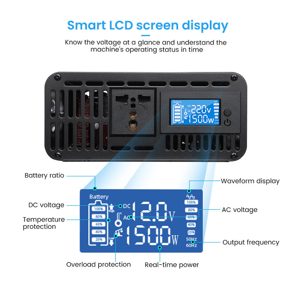 | Особенности | Индикатор работы Чистая синусоида Дисплей |