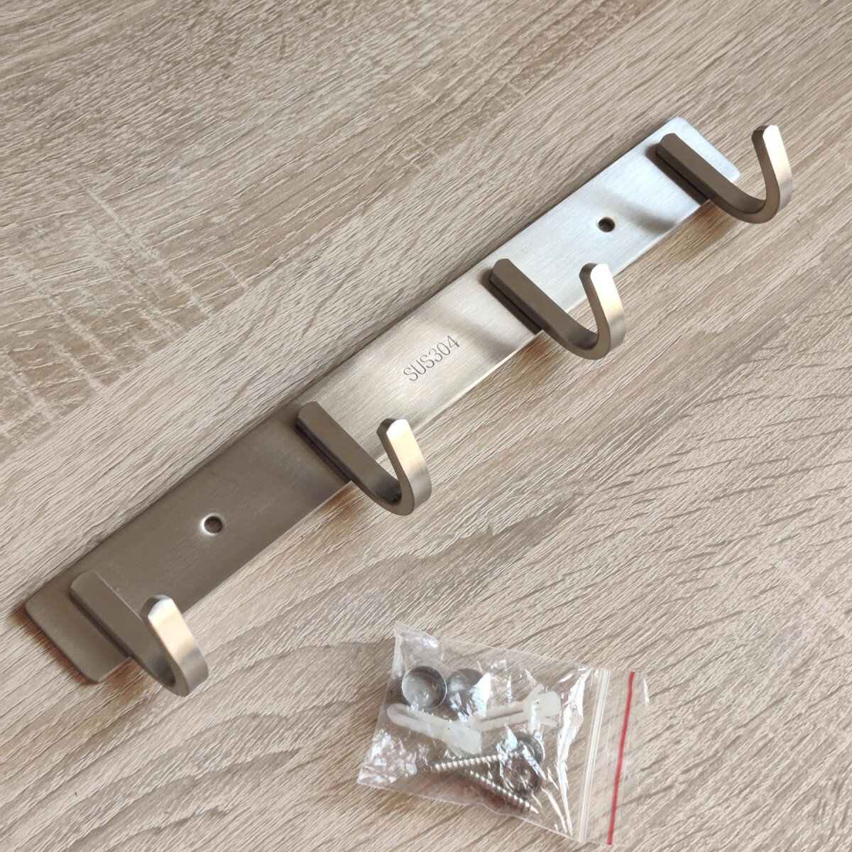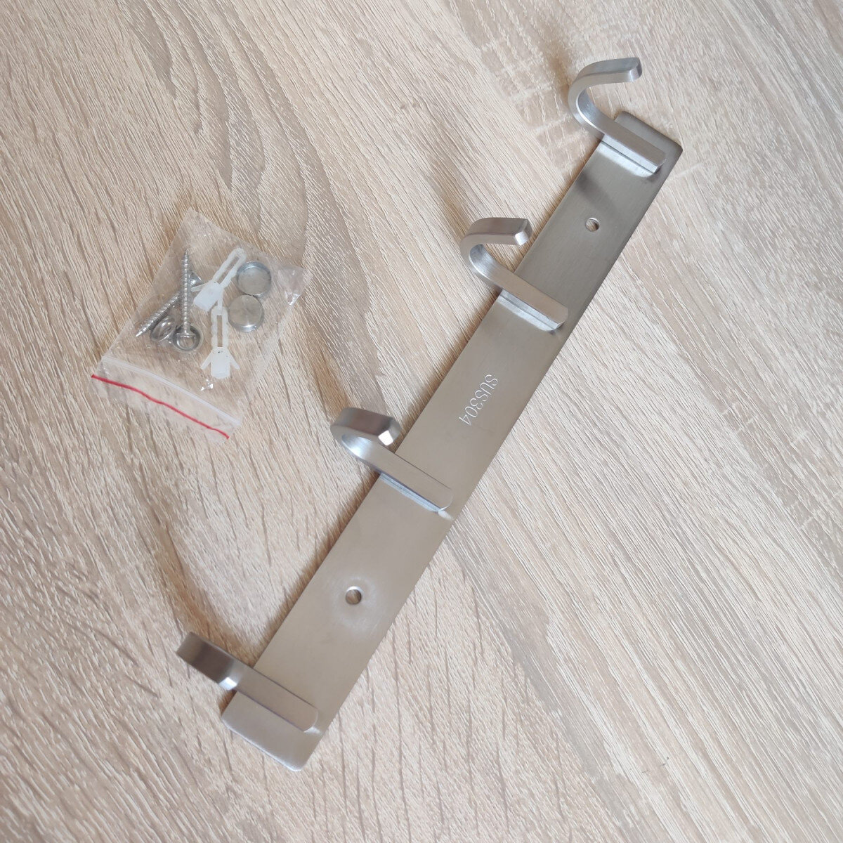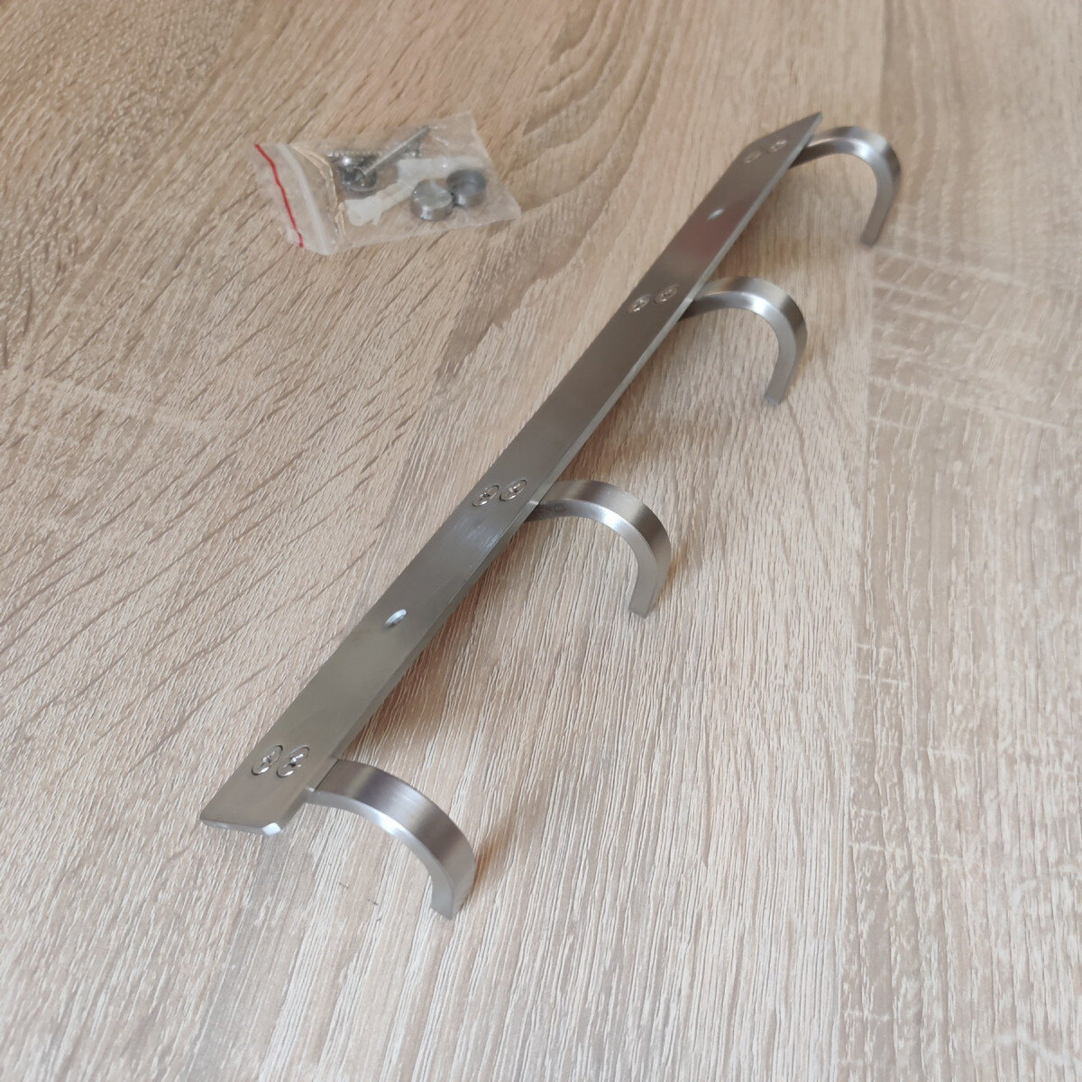 Вішалка із нержавіючої сталі. Виготовлена ​​з товстого матеріалу, не гнеться. Матова поверхня. Кріпиться шурупами.