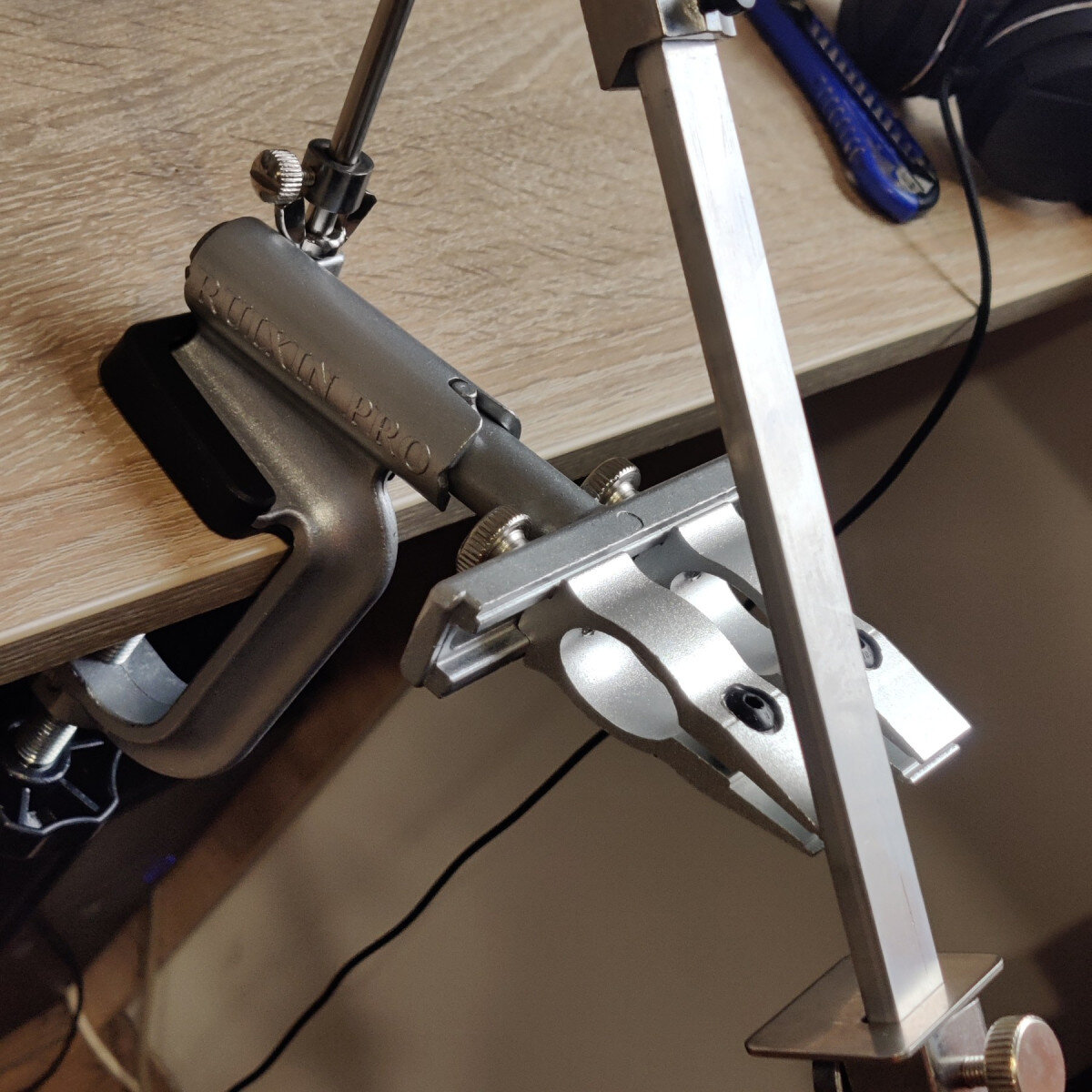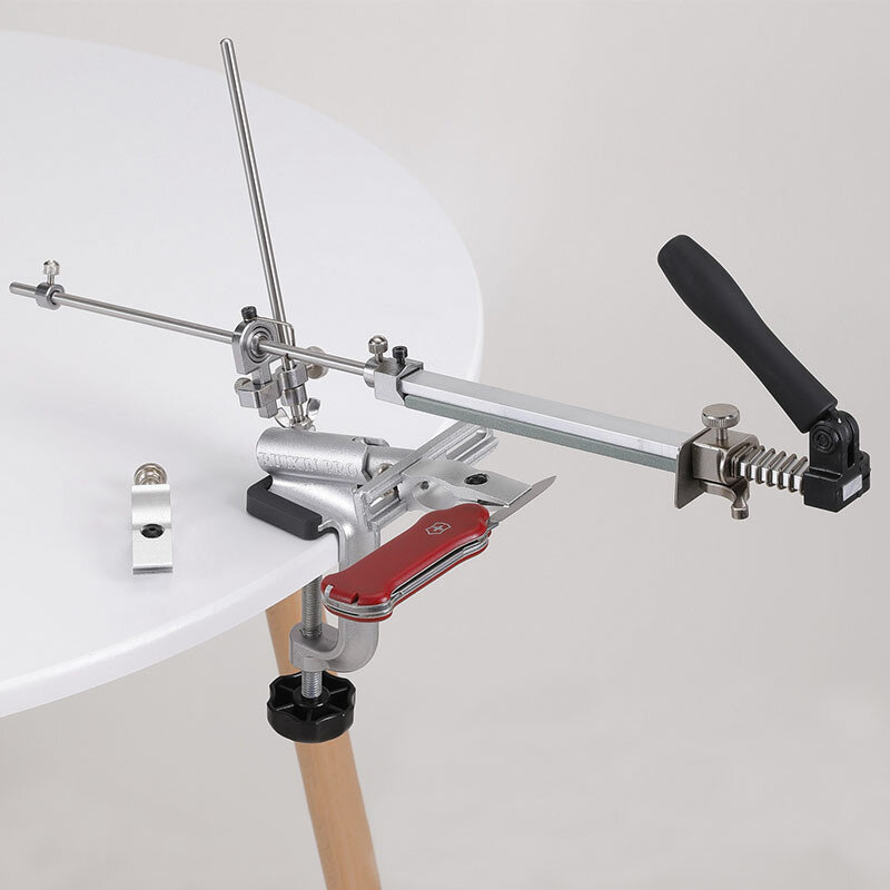 Точильний верстат для професійного заточування ножів. Товар обдаднано поворотним шарніром та подвійний затискачем, що робить верстат максимально зручним та універсальним.