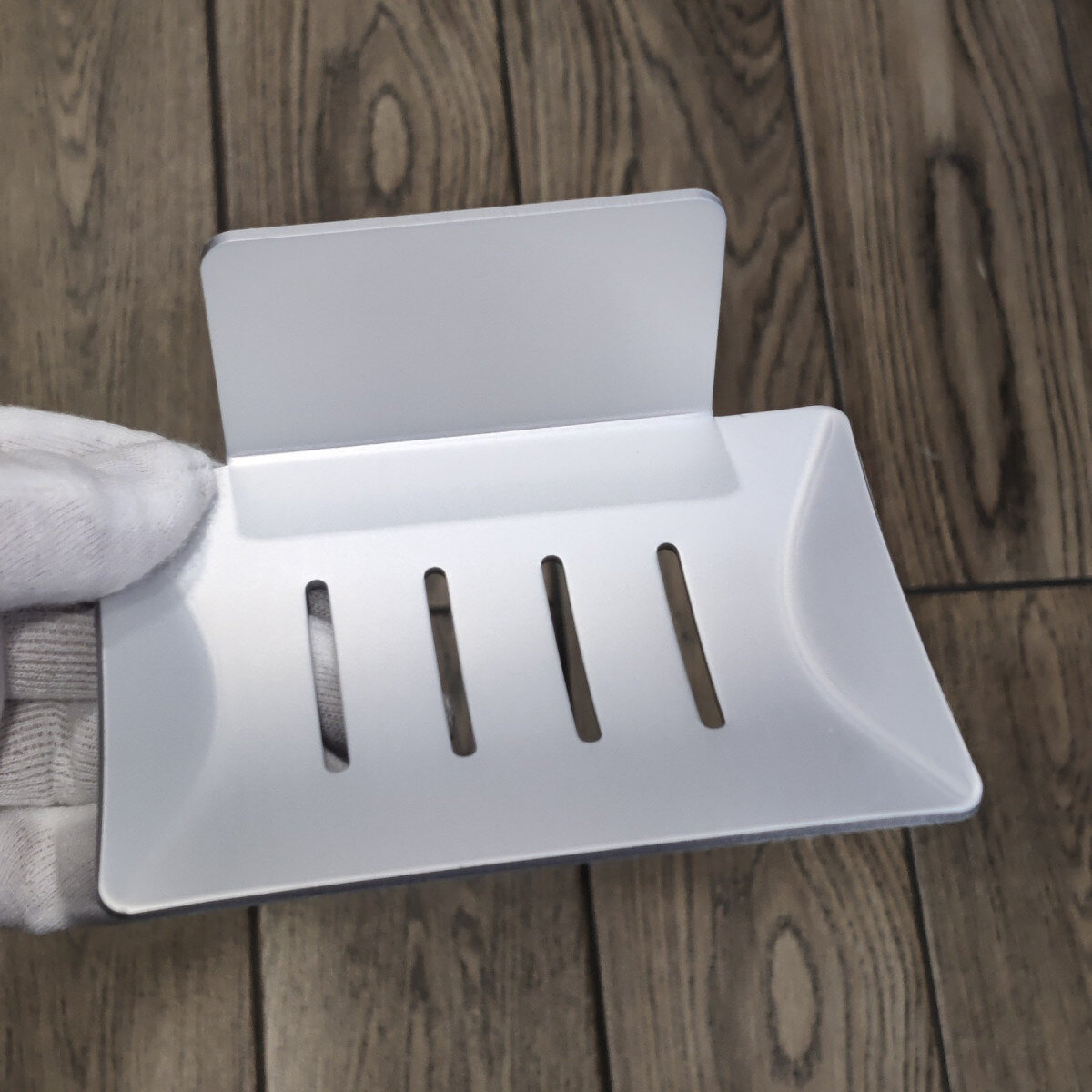 Мильниця з товстого алюмінію, жорстка та стильна. Виглядає набагато дорожче пластикових і мильниць з нержавіючої сталі. Не боїться корозії. Кріплення на стіну – клей.
