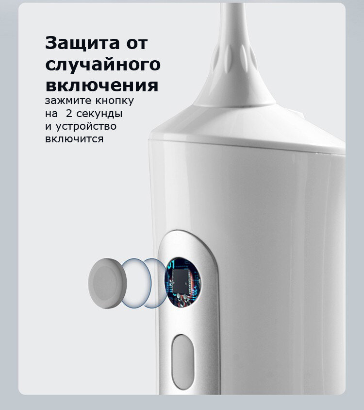 Є захист від випадкового включення . Для увімкнення пристрою необхідно затиснути круглу кнопку на 2-3 секунди, прилад увімкнеться. Це дуже важлива функція яка захистить ваше обличчя та меблі ванної кімнати від випадкового розбризкування води, що часто зустрічається у звичайних іригаторів.