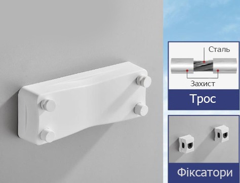 Автоматична мотузка для білизни використовується для сушіння білизни на балконі, у ванній кімнаті, на кухні або в будь-якому іншому зручному місці. Система має фіксатор, завдяки якому трос розтягується на потрібну відстань (максимум 5,2 метра).