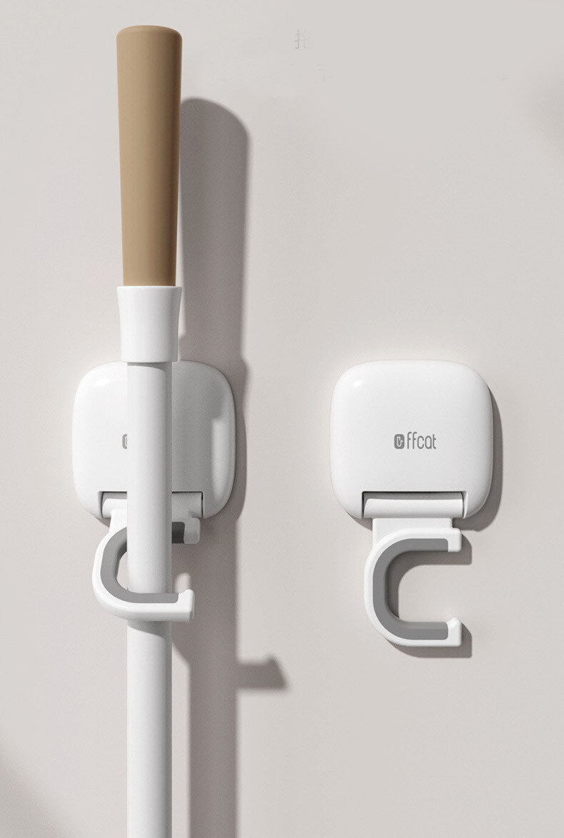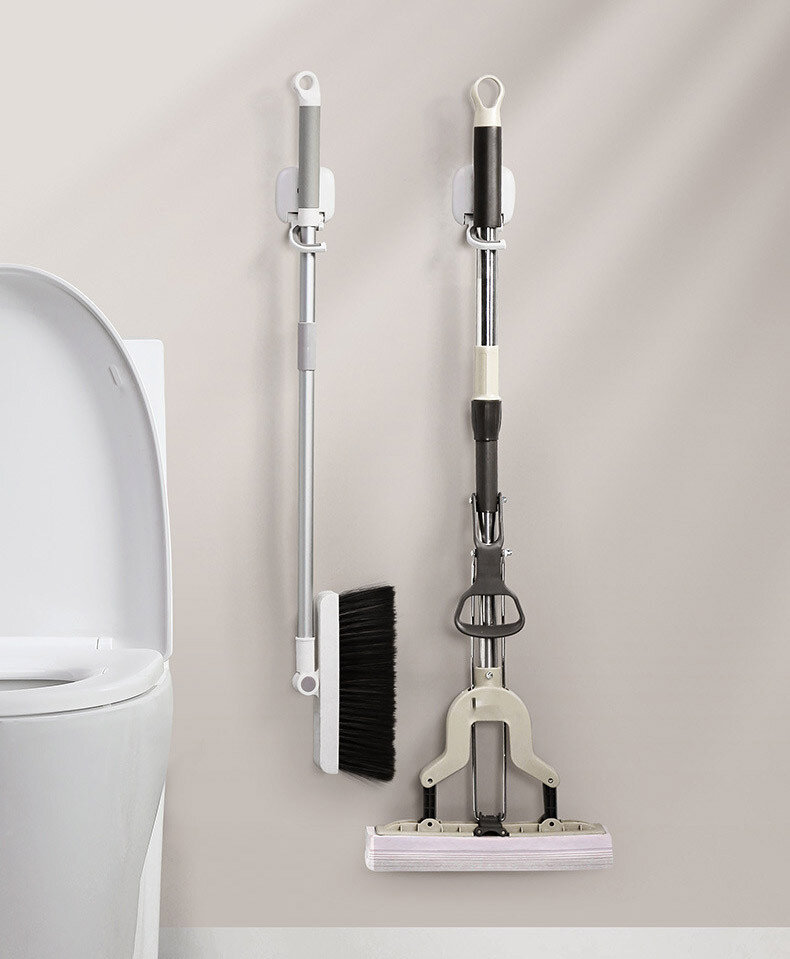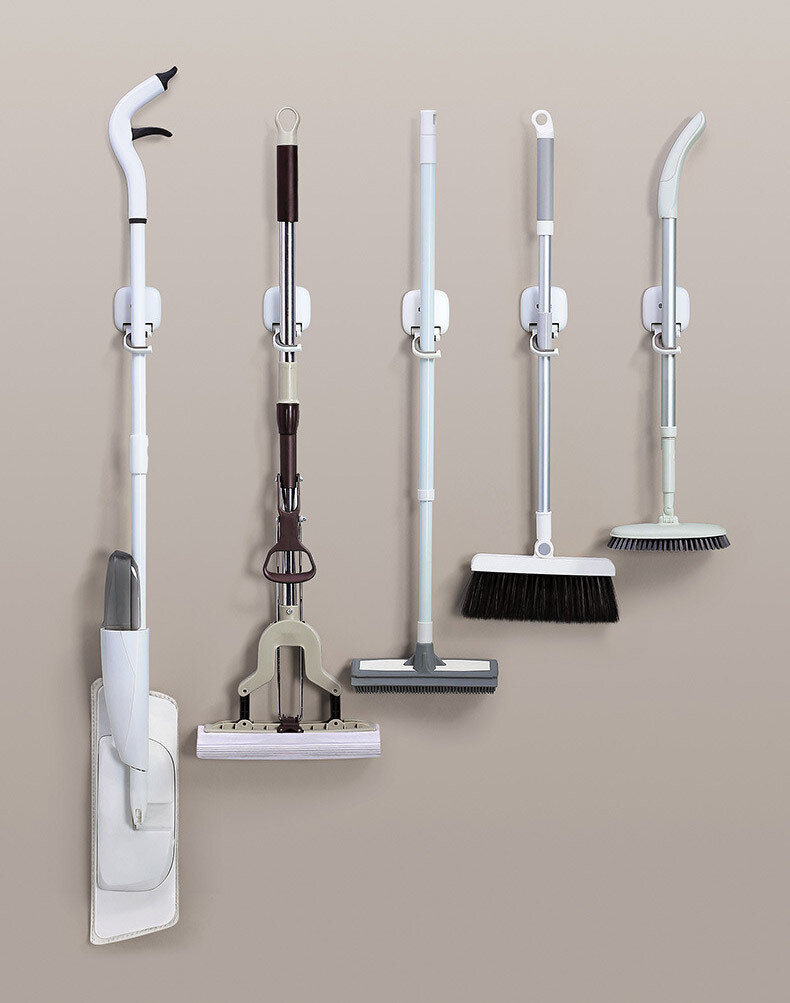 Настінний тримач для зберігання швабри, щіток та іншого інвентарю, підійде як для ванної кімнати, так і для передпокою та кухні. Його можна використовувати для зберігання йоржиків, швабрів та кухонних предметів зі стрижнем. Кріплення - основа, що самоклеїться. Виріб займає мінімум місця.