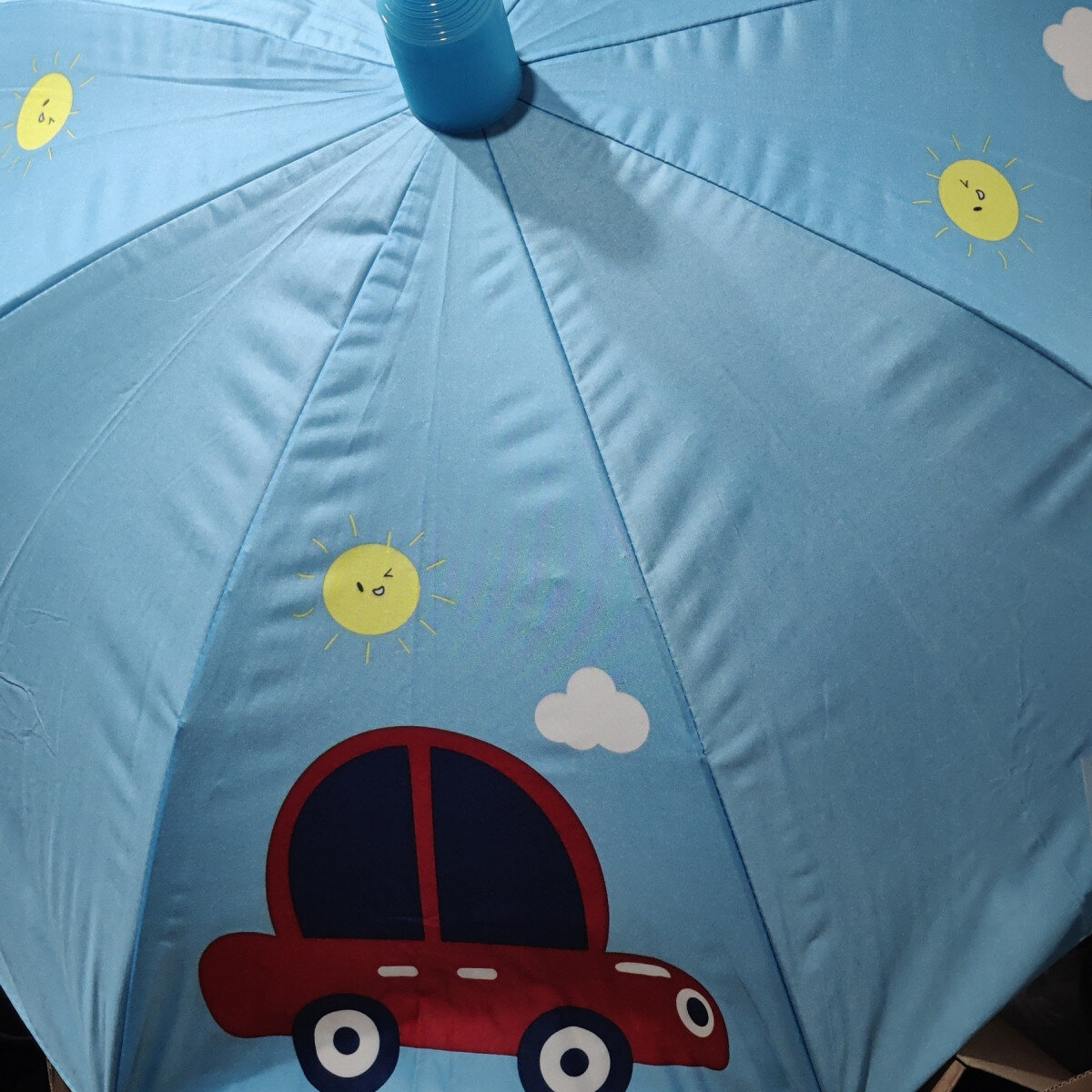 Бюджетный зонт-трость диаметром 85 см. Принт - машинка, голубые оттенки. Чехол - пластиковый телескопический (может быть как на зонте так и можно его снять).