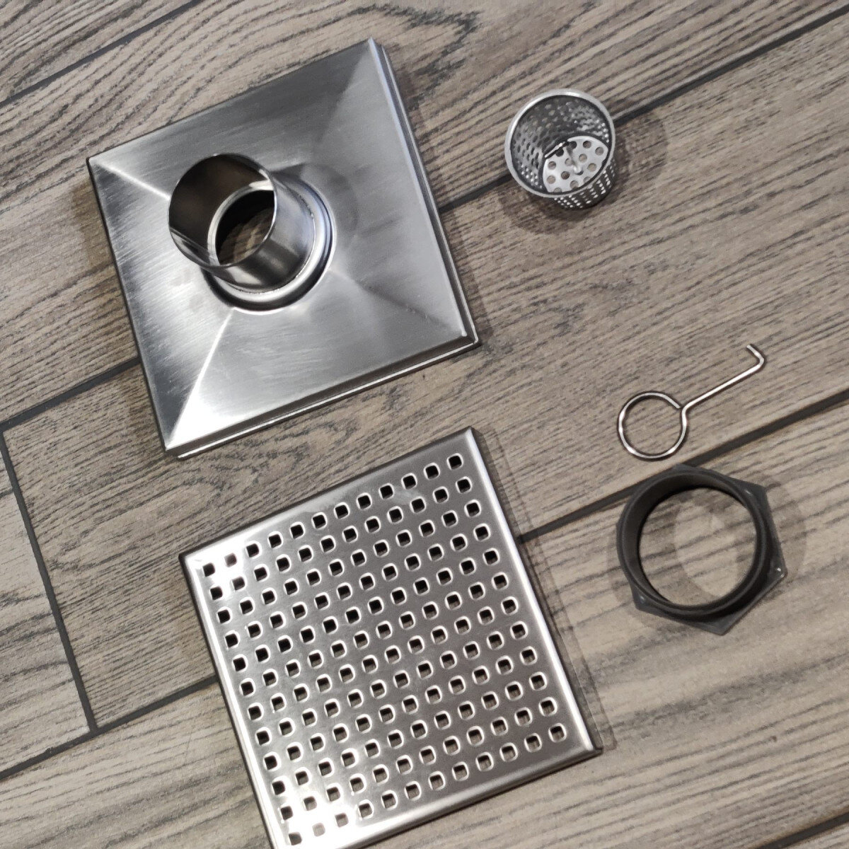 Комплектація - трап з ґратами, кошик, гачок, пластикова гайка з прокладкою (потрібно для деяких сифонів)