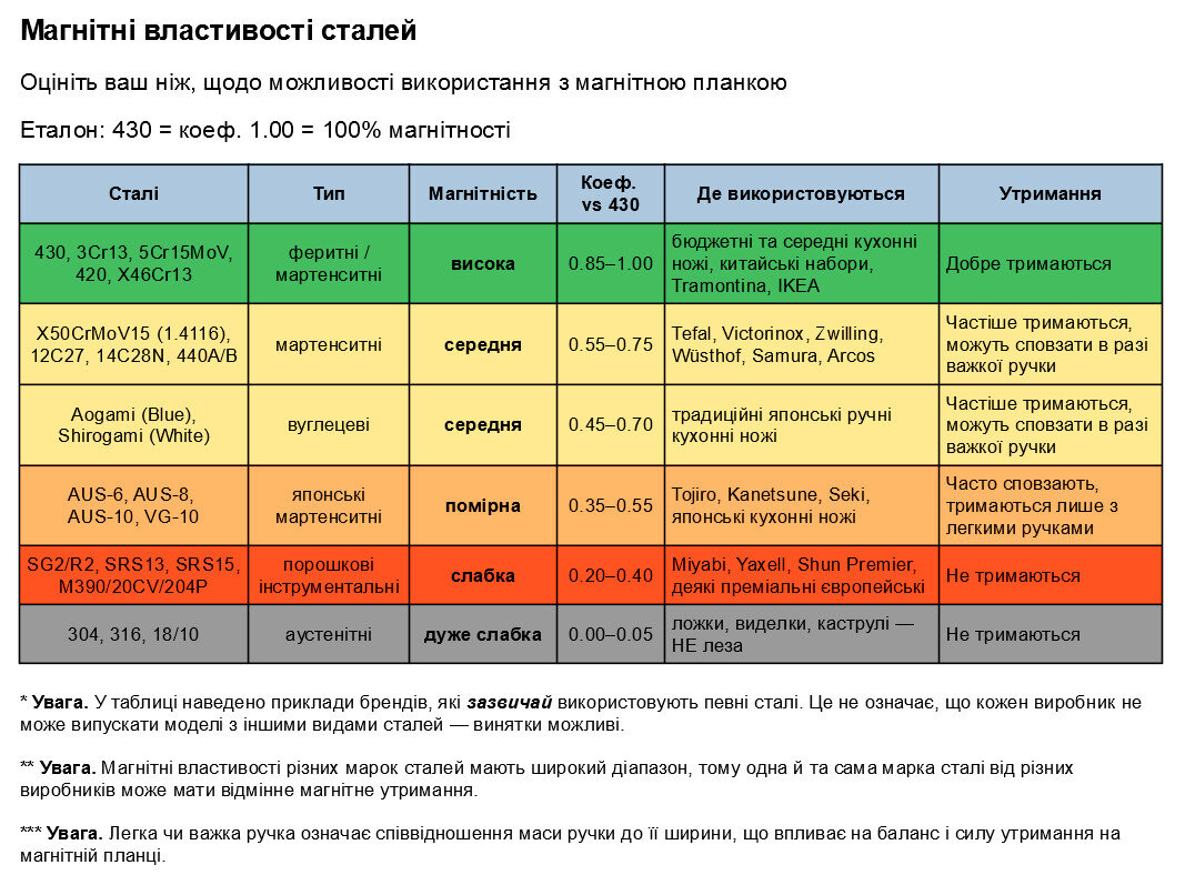 Ви можете використовувати магнітну планку тільки з ножами із магнітних матеріалів. Наприклад кераміка та нержавіюча сталь не магнітяться.