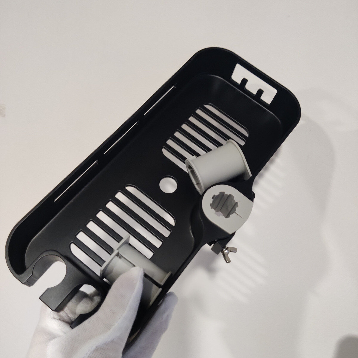 Полиця на душову стійку, виготовлена ​​із пластику. Має гачки та місце для душової лійки.