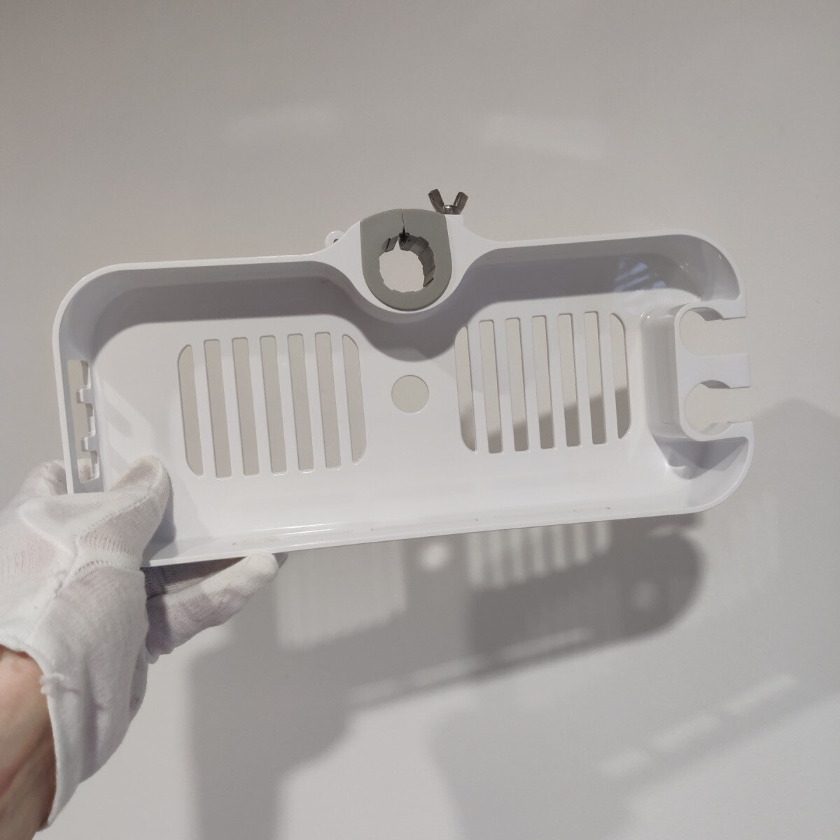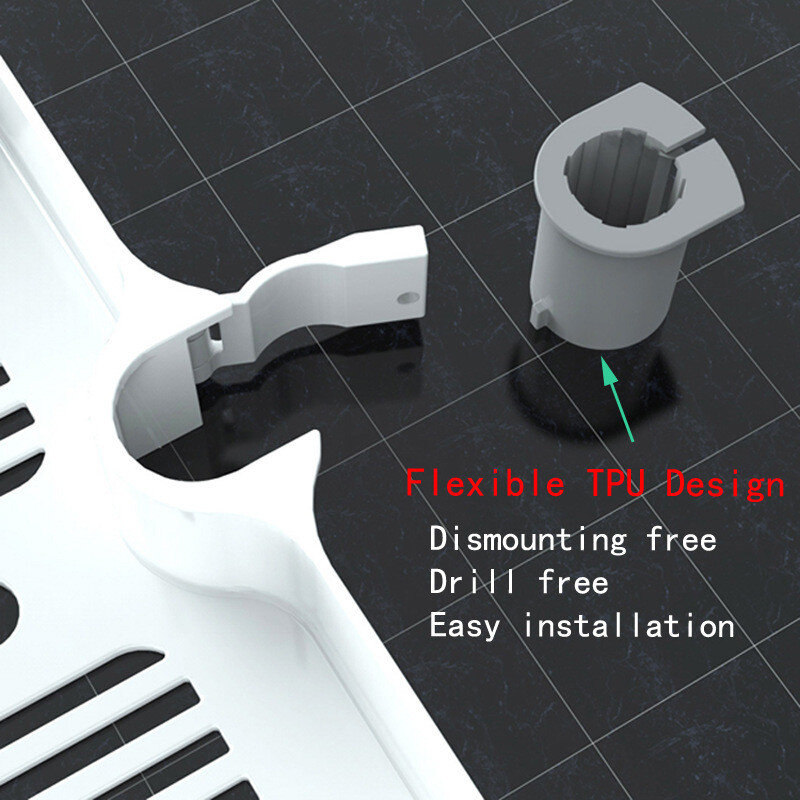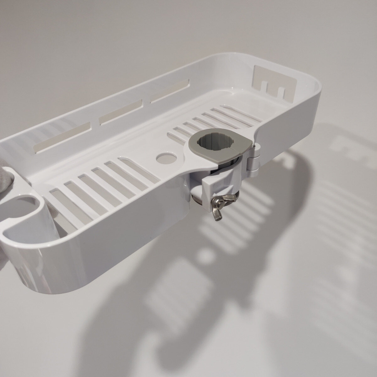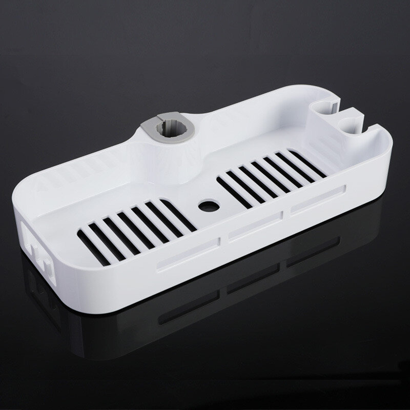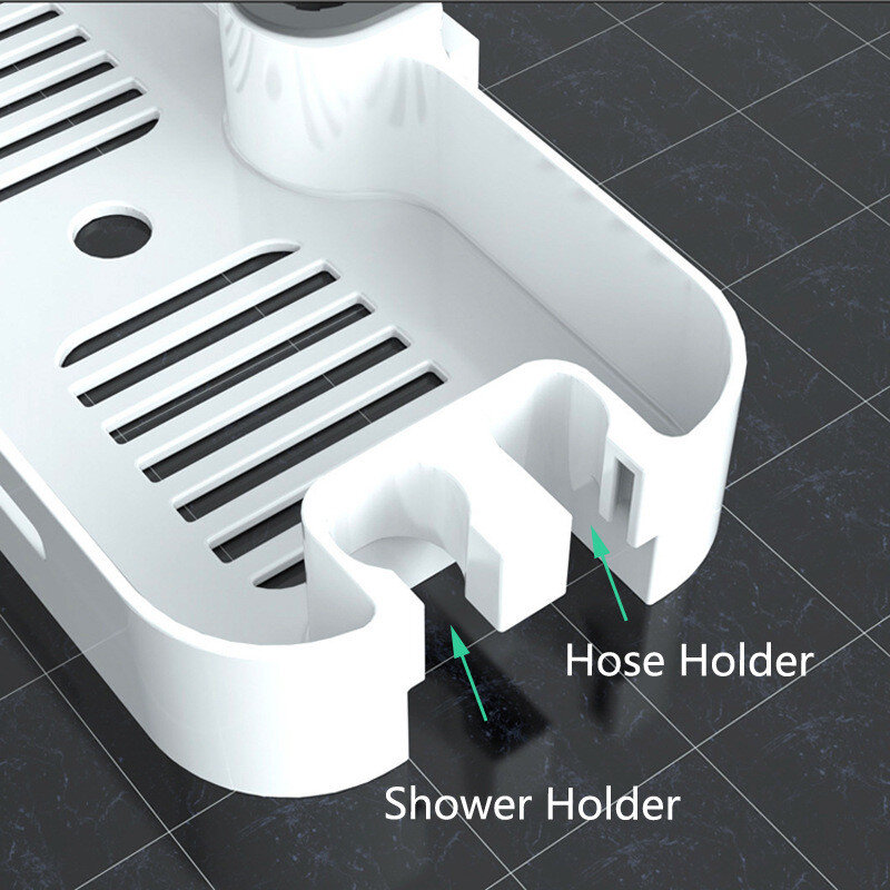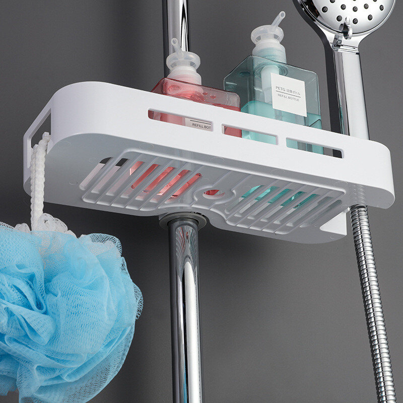 Полиця на душову стійку, виготовлена ​​із пластику. Має гачки та місце для душової лійки.