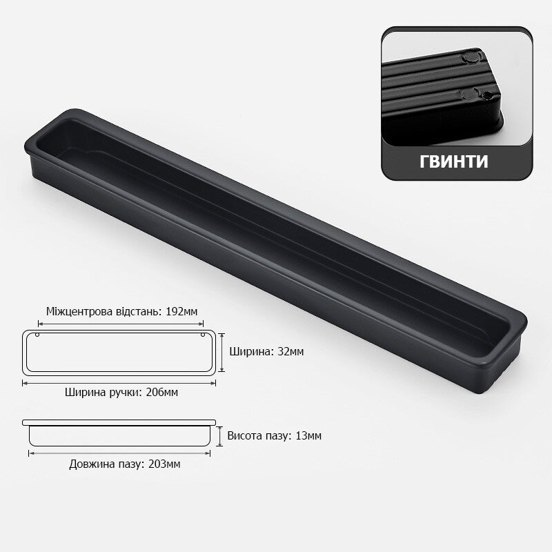 Меблева ручка з алюмінію призначена для врізної установки у фасади. Одночасно тонка, але досить широким отвором під пальці.