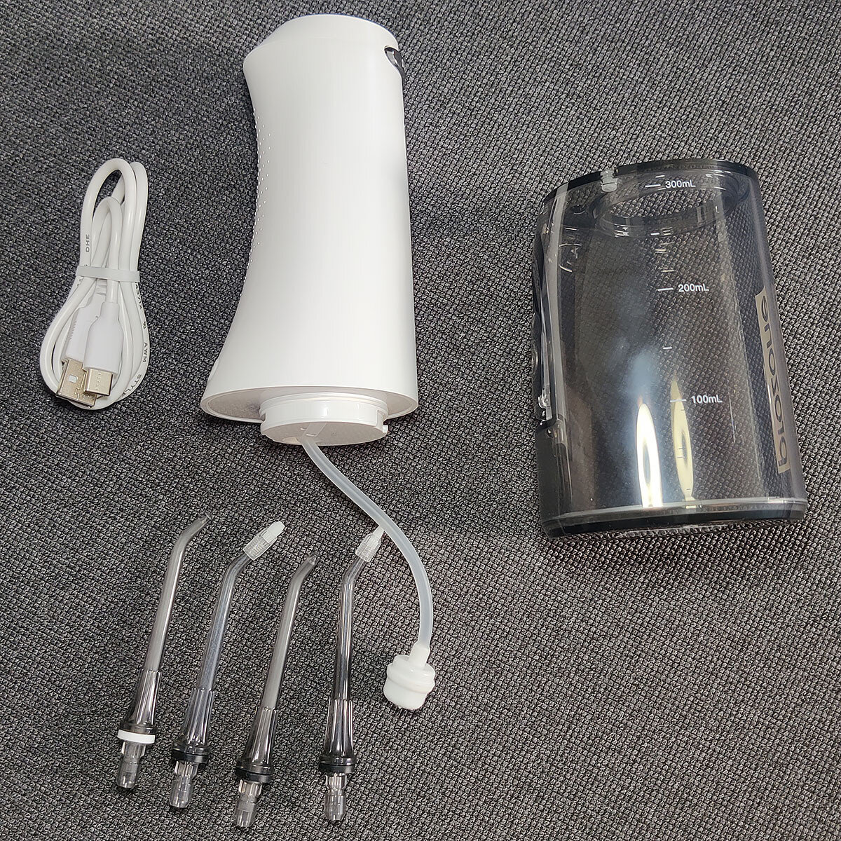 Електроніка та конструкція. Прилад обладнаний довговічним електричним підшипниковим приводом і сучасною електронікою. Керується прилад двома кнопками, це зручніше, ніж однією. Існує захист від випадкового включення та вимкнення (довге натискання на кнопку). Заряджання - через USB Type-C, якщо ви втратите кабель - його легко замінити іншим, наприклад від телефону. Місткість акумулятора 2000 мА гарантується виробником. Водяна помпа більше, ніж в аналогічних іригаторах, тому тихіше він не буде (але якість водяного струменя буде висока). Фіксація насадок металевим фіксатором (надійно), прокладка - самоущільнювальна (не протікає під час роботи), може обертатися на 360 градусів. Резервуар – знімний, його легко помити.