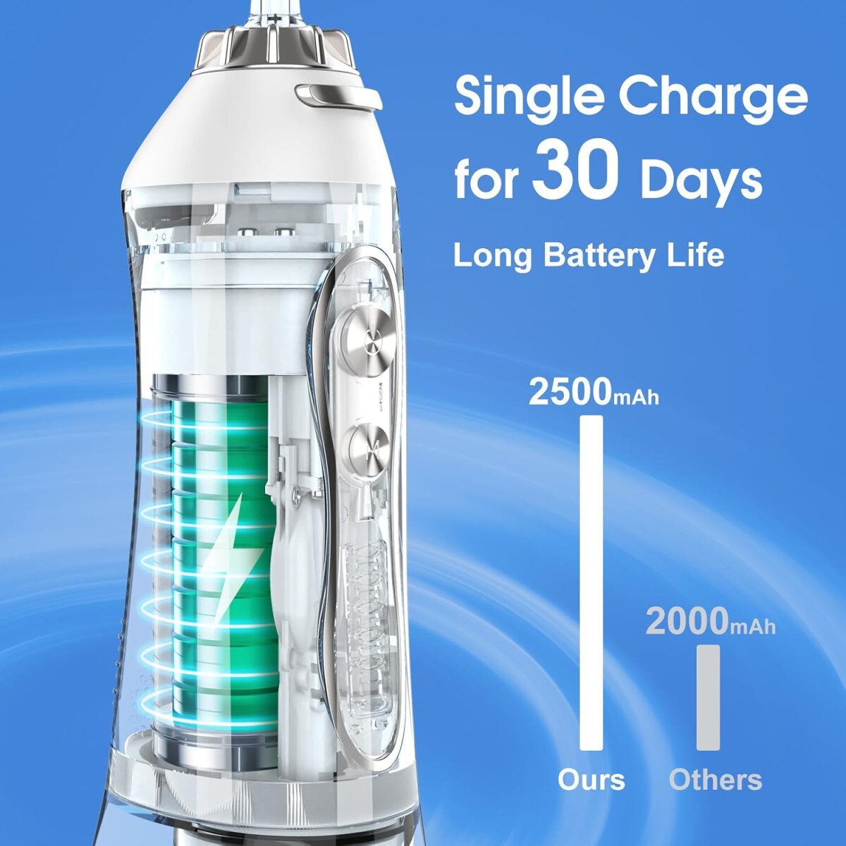 Пристрій має водонепроникний корпус з класом захисту IPX7, що дозволяє використовувати його навіть у душі. Завдяки інноваційному дизайну з гравітаційною кулькою на кінці трубки, вода подається рівномірно незалежно від нахилу пристрою. Іригатор також підходить для догляду за брекетами, імплантами, коронками та іншими ортодонтичними конструкціями.