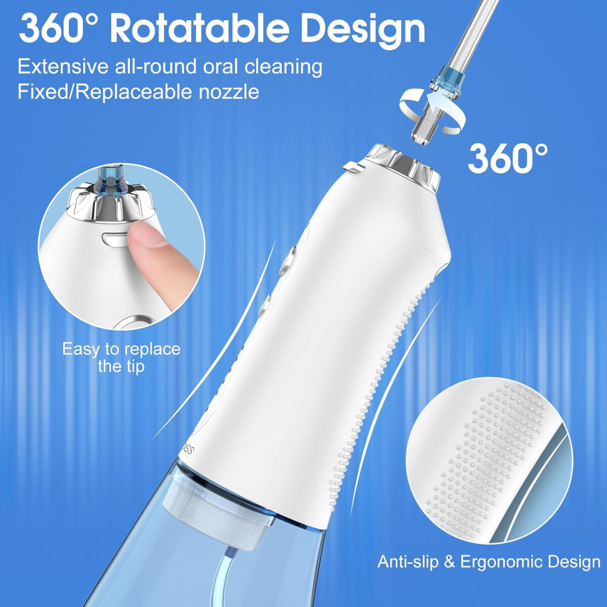 У комплект входять 5 змінних насадок для різних потреб: стандартна, ортодонтична, пародонтологічна, для чищення язика та щітка. Насадки обертаються на 360 градусів, що забезпечує зручність у використанні та доступ до важкодоступних місць.