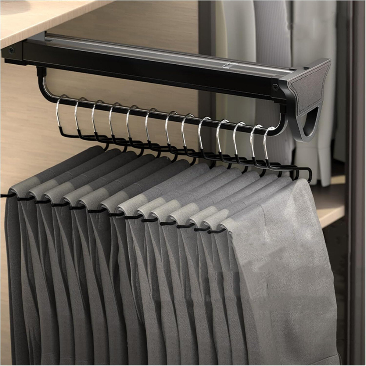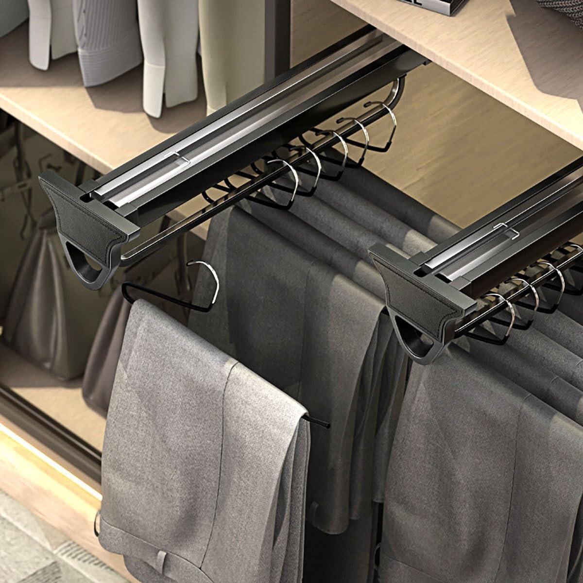 Висувна штанга-мікроліфт поєднує естетику, зручність і надійність — ідеальне рішення для сучасних гардеробних систем.