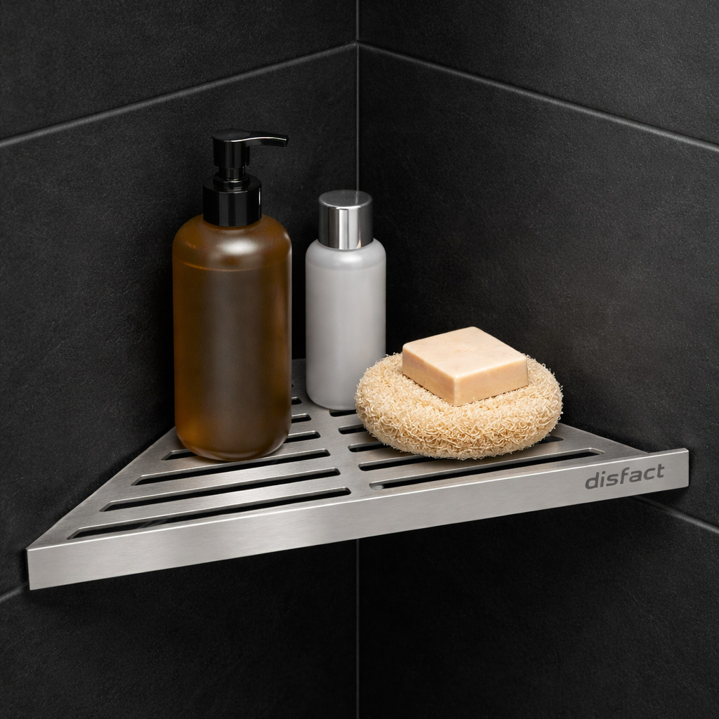 Міцна кутова полиця з нержавіючої сталі 304 для акуратного зберігання у ванній кімнаті. Товщина металу 1.8 мм забезпечує жорсткість, а брашована матова поверхня виглядає сучасно та практично в догляді.