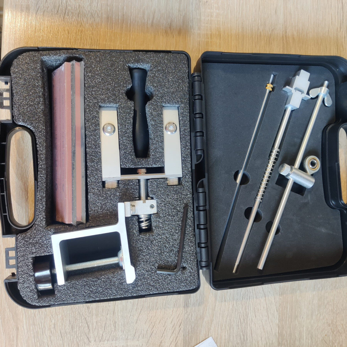 У комплект входять 4 точильні камені для різних етапів заточки. Верстат постачається у пластиковому кейсі, що зручно для зберігання та транспортування.