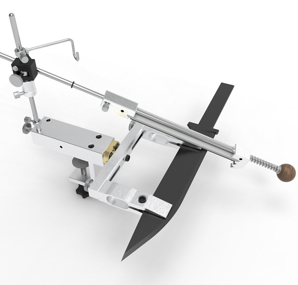 Професійний точильний станок для точної заточки ножів з жорсткою фіксацією клинка, поворотним механізмом та плавним ходом направляючого штока. Конструкція розроблена для стабільної роботи, високої повторюваності кута та комфортної заточки як прямих, так і складних за формою клинків.