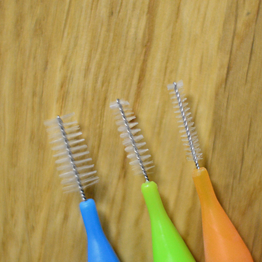 Щіточки із тонким стрижнем дозволяють очищати не тільки брекет-систему, а й міжзубні проміжки. Для очищення брекетів більше підходять щіточки середнього чи великого діаметра.