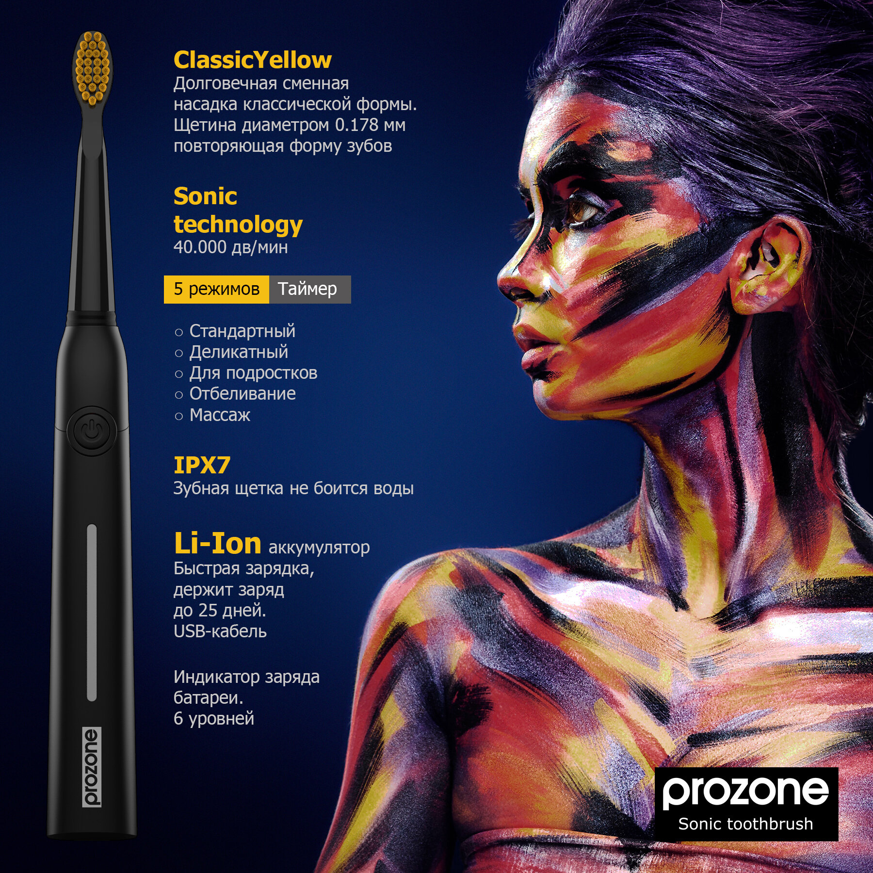 Зубна щітка ProZone працює за звуковою технологією (не ультразвук), частота вібрацій залежить від вибраної програми (максимум 40 000 дв/хв). Це безпечне чищення зубів, пломби, коронки — будуть у безпеці.