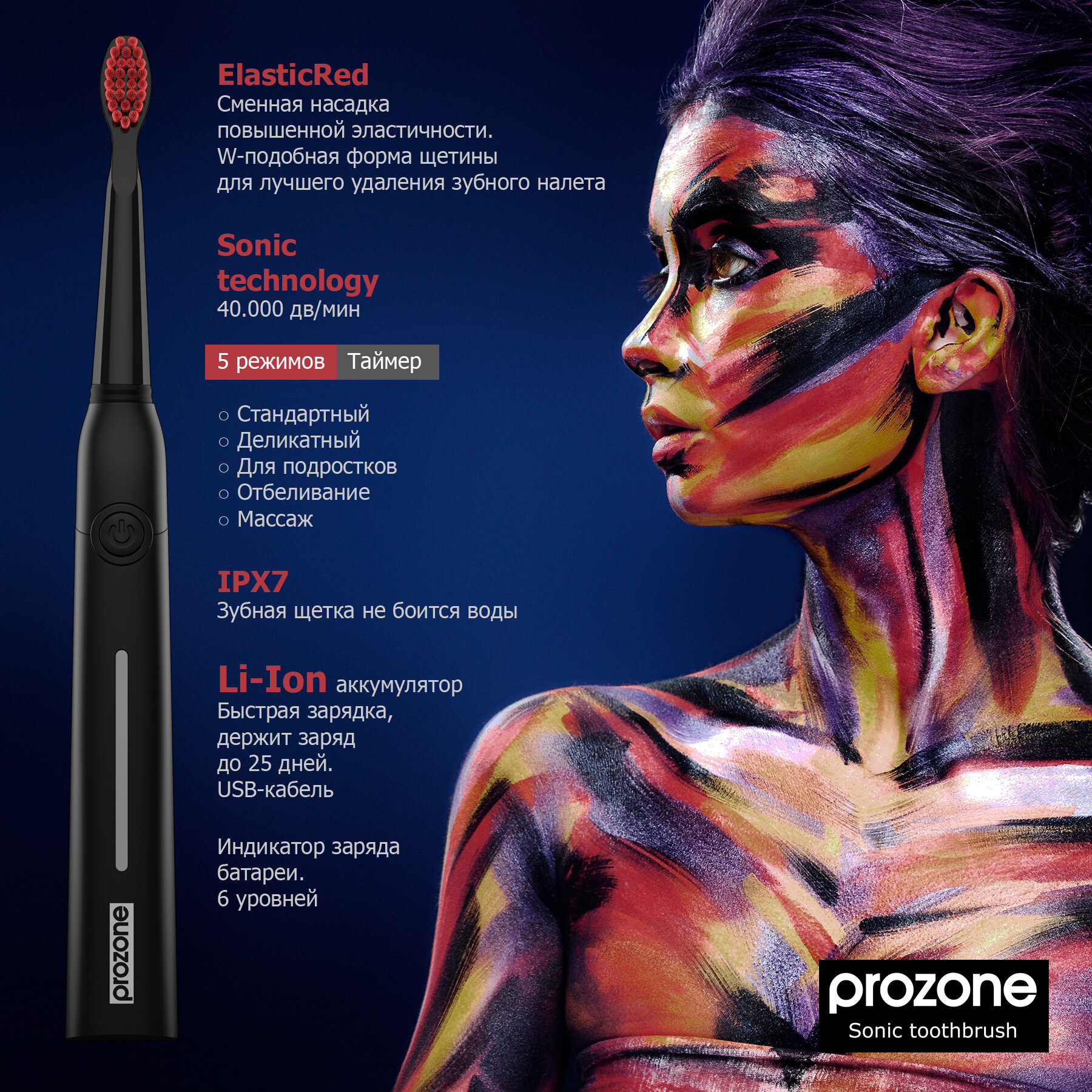 Зубна щітка ProZone працює за звуковою технологією (не ультразвук), частота вібрацій залежить від вибраної програми (максимум 40 000 дв/хв). Це безпечне чищення зубів, пломби, коронки — будуть у безпеці.
