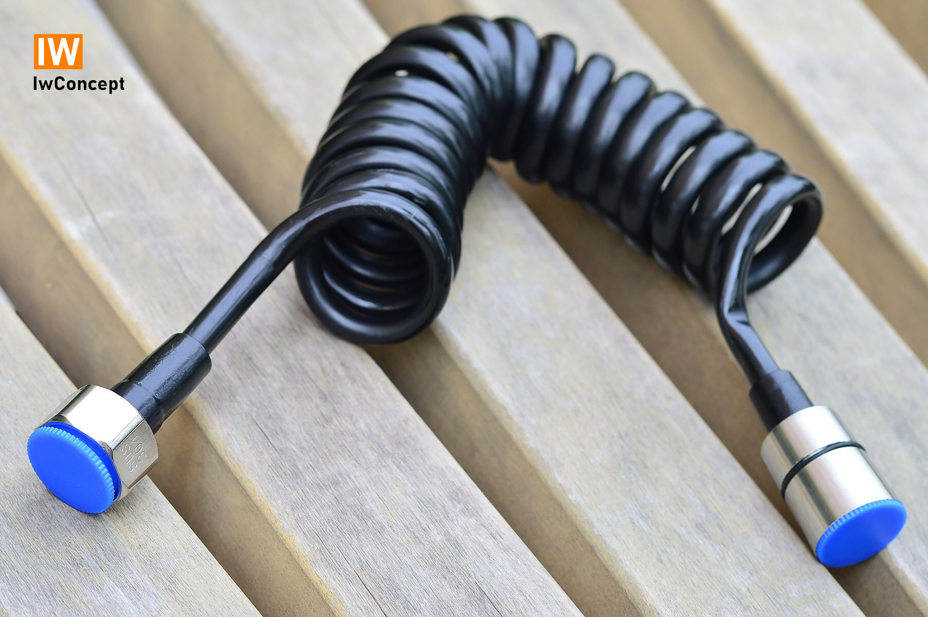 Шланг для гигиенического душа (бидетты) спиральной формы. Не занимает много места, после вытягивания возвращается в прежнее положение. Гайки подключения на 1/2 дюйма, изготовлены из нержавеющей стали. Присутствуют уплотняющие прокладки.